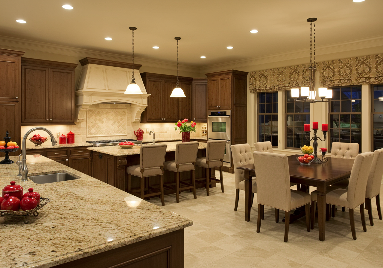 The 2000s Tuscan cooking style was predominantly dark red, chocolate brown, and gold. The lighting is richly decorated with wrought iron finishes. Granite is frequently stained with gold, and cabinets are dark brown. This style now looks outdated which prompts more homeowners to renovate.