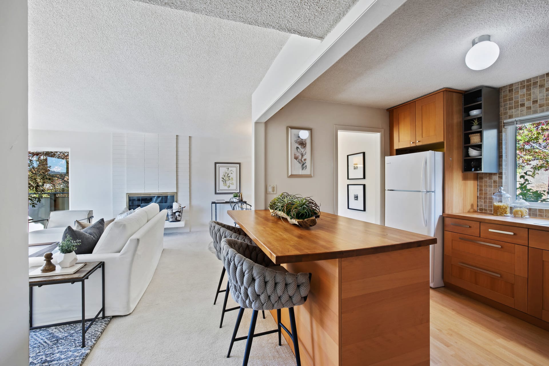 The pristine, contemporary kitchen features stunning wood countertops and cabinetry,