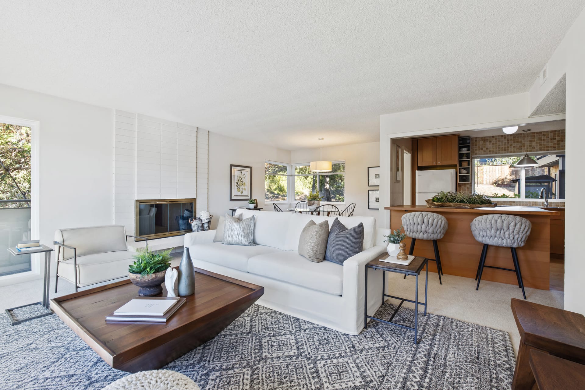 dining room and the spacious living room with a fireplace for cozy evenings.