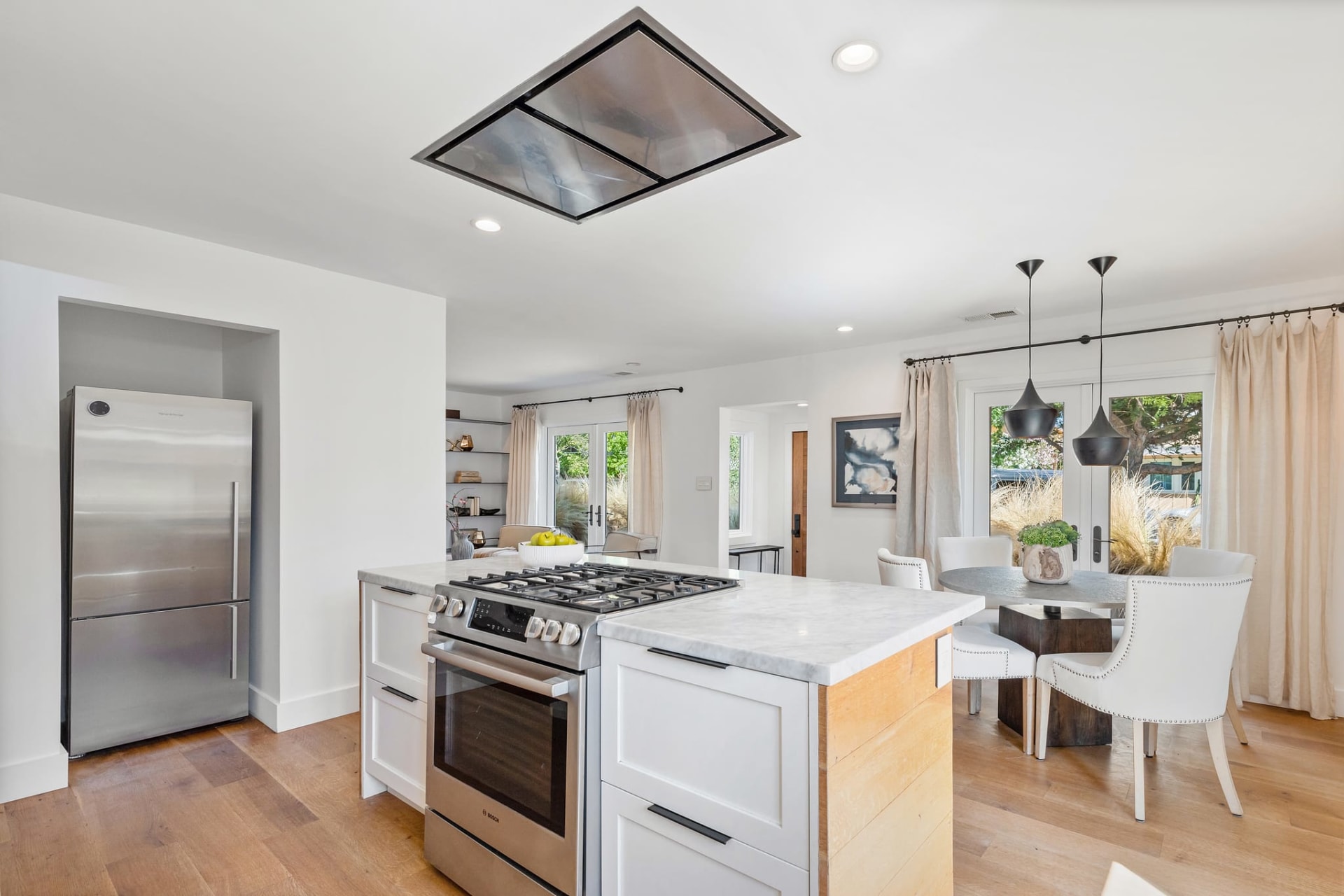 The primary bedroom retreat features private access to the verdant backyard, a skylit shower, and a heated toto washlet. Off-street parking leads to the peaceful detached ADU, with a fireplace, full bathroom, and kitchenette.