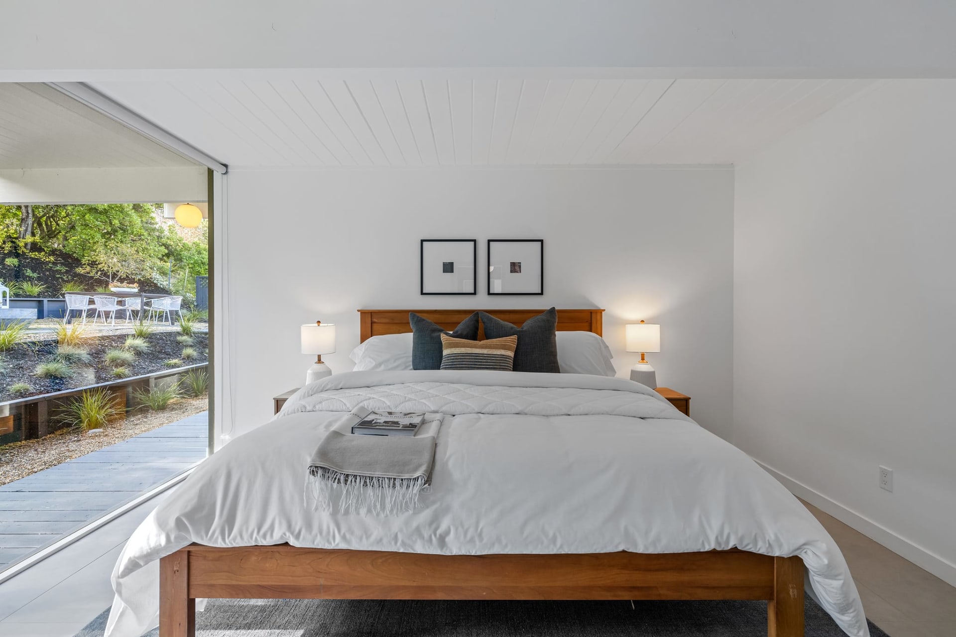 The primary suite is a private retreat, complete with a walk-in closet, en-suite bathroom with Heath Ceramics tile, Italian porcelain tile flooring, dual sinks, a shower, and a separate tub. High-end remodel designed by Blaine Marshall Architects.