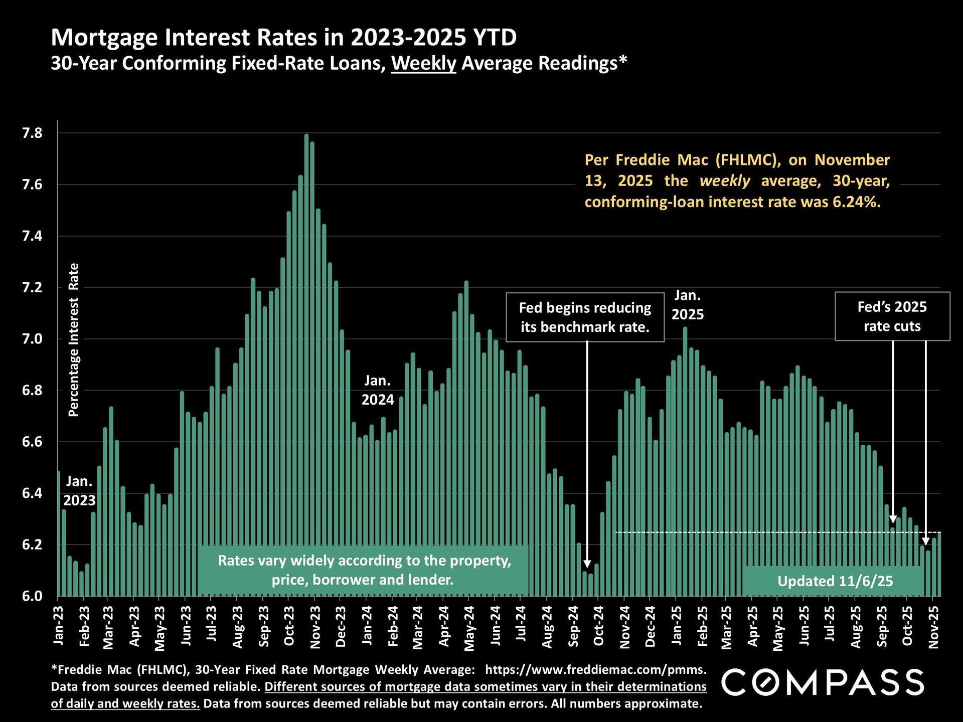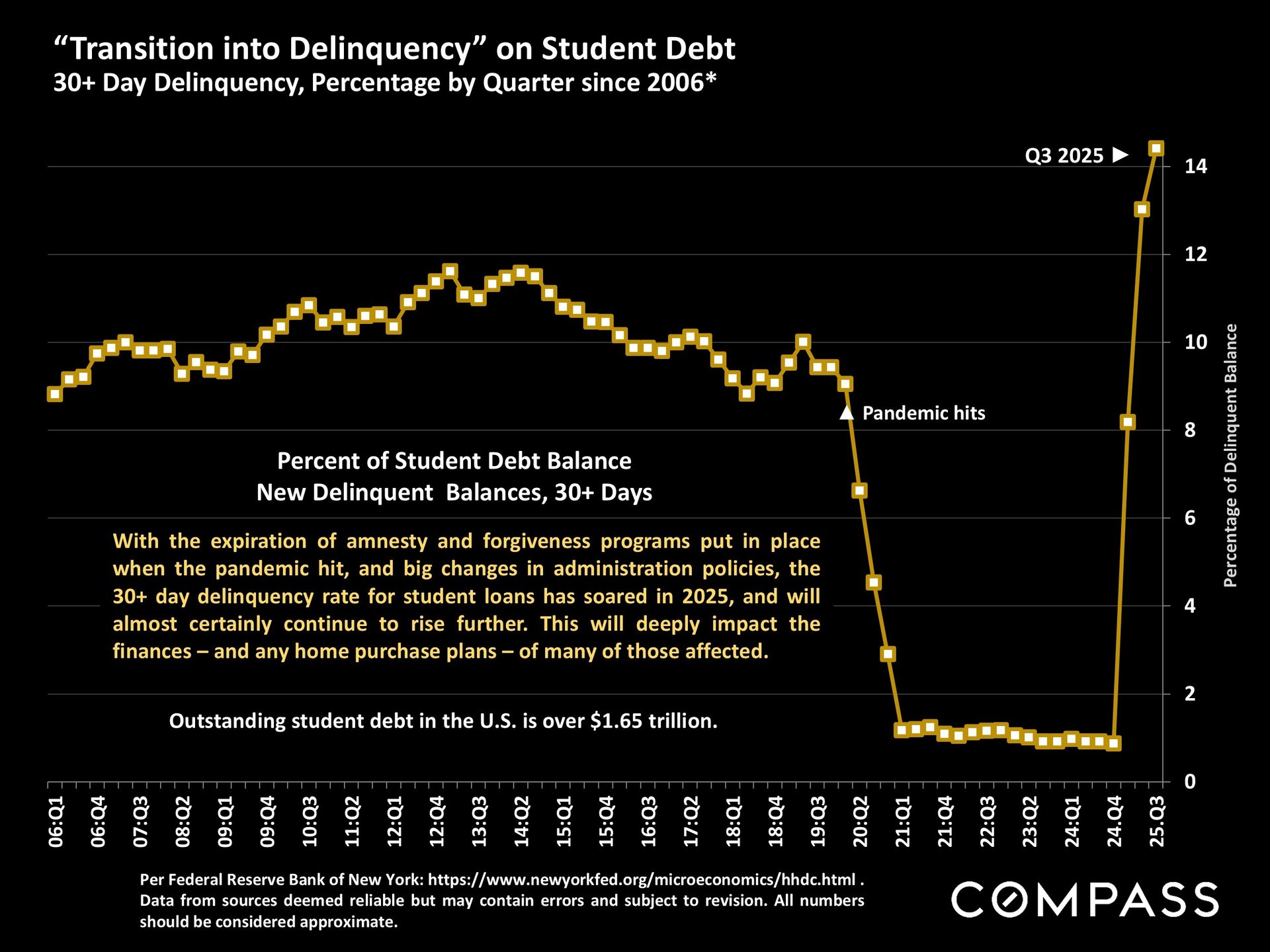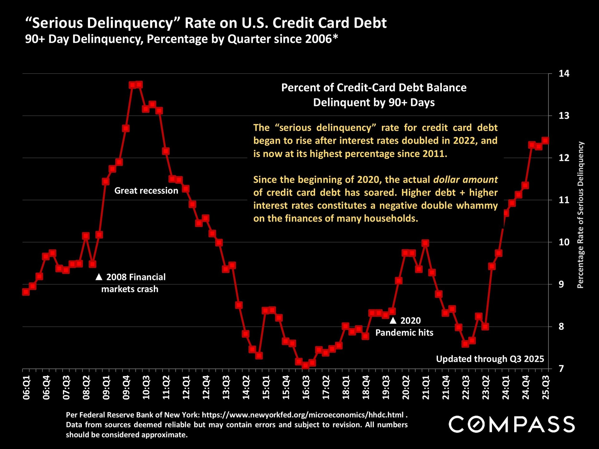 From Bloomberg News, 11/12/25: "The share of subprime borrowers at least 60 days past due on their auto loans rose to 6.65% in October, the highest in data going back 31 years." Of course, subprime borrowers typically play negligible roles in most of our housing markets.