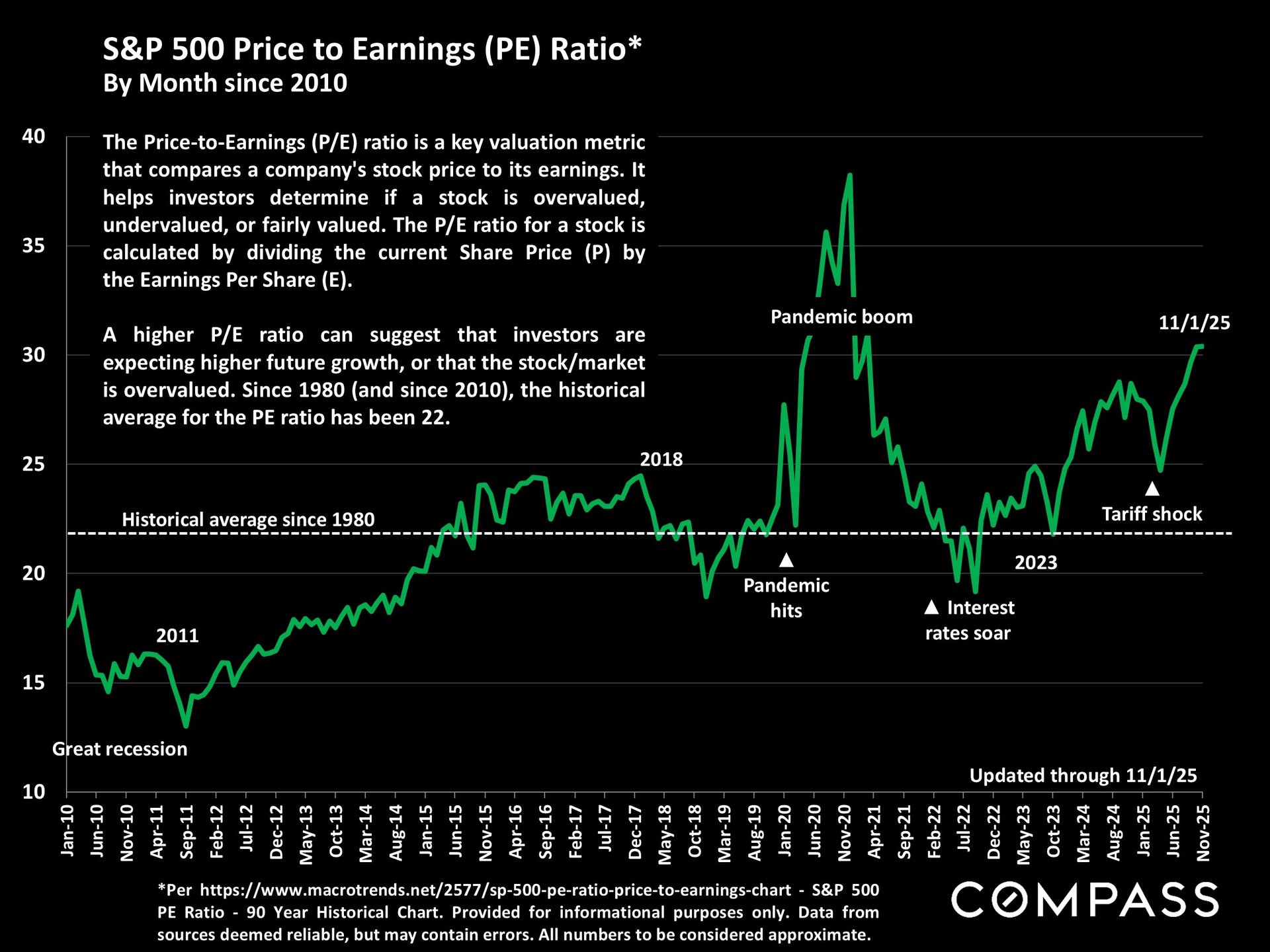 One of the ways that analysts evaluate stock market values is by the Price/Earnings (PE) Ratio, which has been running well above its long-term average, and is at its highest reading since the pandemic boom: See chart below. The Economist uses a somewhat different version of the PE Ratio, using "underlying, cyclically adjusted earnings," and in the 11/8/25 issue said, "To buy the basket of stocks in America's S&P 500 share index, investors now pay 40 times their underlying, cyclically adjusted earnings - a multiple exceeded only during the dotcom bubble, and then not by much." Their article was ominously titled, "Before the Fall." I am not expressing an opinion on the existence or not of a stock market or AI bubble: It is extremely hard to predict the peak of market booms, and there are a lot of dynamics at play.