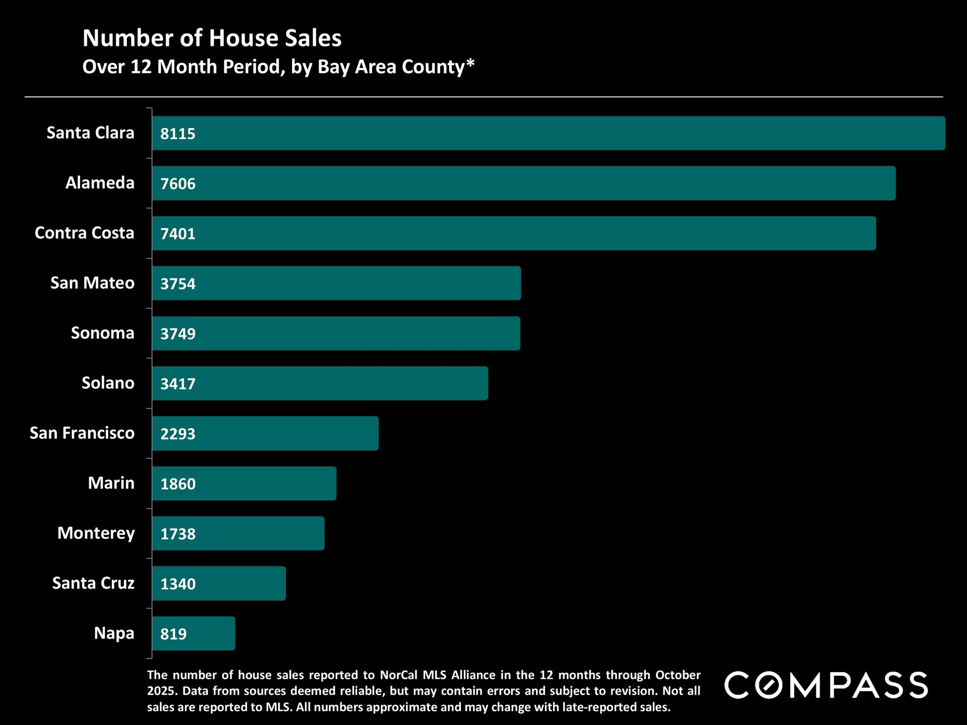 Comparing house and condo sales volumes across Bay Area Counties. Most people don't realize, for example, what a small house market San Francisco has: Less than 2300 sales in the last 12 months, spread across 70+ neighborhoods. When demand rises - as it is now due to the AI start-up boom - and inventory falls, as is occurring, it can become highly pressurized very quickly.