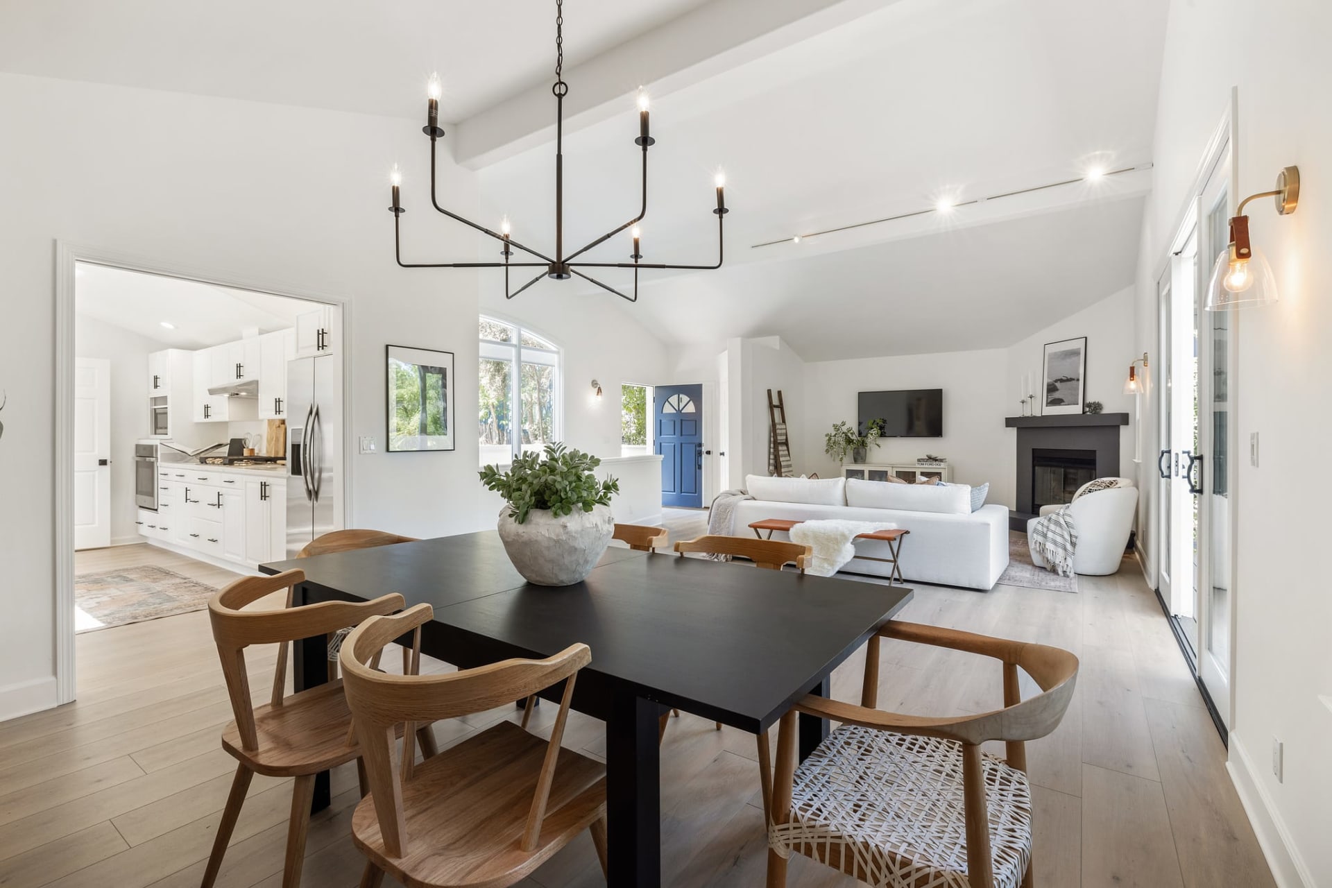 The main level features a spacious living room with a fireplace, a formal dining area, and a gourmet kitchen equipped with high-end appliances and custom cabinetry.