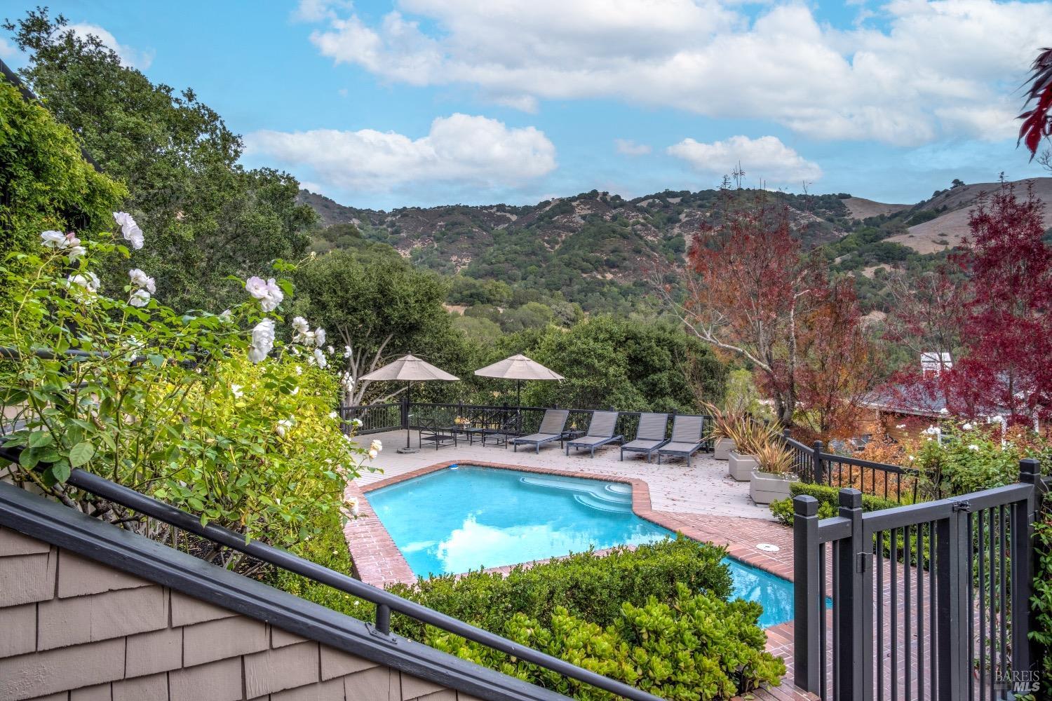 The outdoor area of this property is a true oasis, featuring an outdoor kitchen, lush lawn, and meandering garden paths. Surrounded by mature oak and Japanese maple trees, the fenced pool and hot tub offer a secluded retreat. The beauty of the Lucas Valley hills envelops the property, providing a tranquil and picturesque setting.
