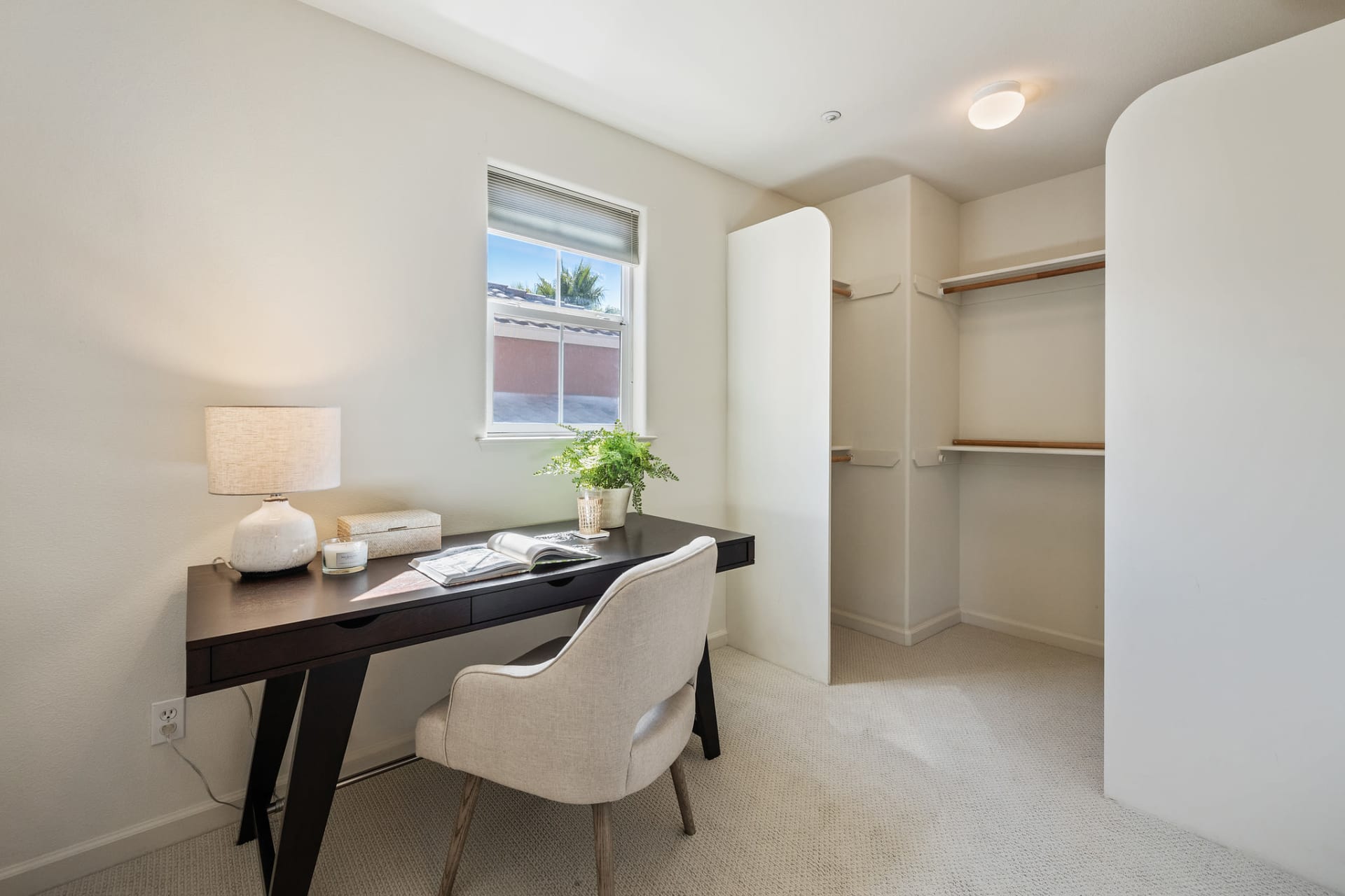 The staircase leads to the two bedrooms with two full baths. The primary suite has a vaulted ceiling with an adjacent space that can be used as an office along with walk-in wardrobe.