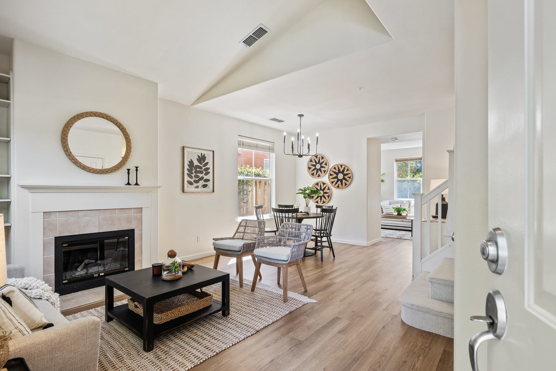 You enter the front door to a large living/dining area with a gas fireplace This leads to a spacious family room which opens to a big backyard for easy entertaining and a washer and dryer in the laundry closet The adjacent large kitchen with breakfast bar has half bath off it along with entry to a one car attached garage.