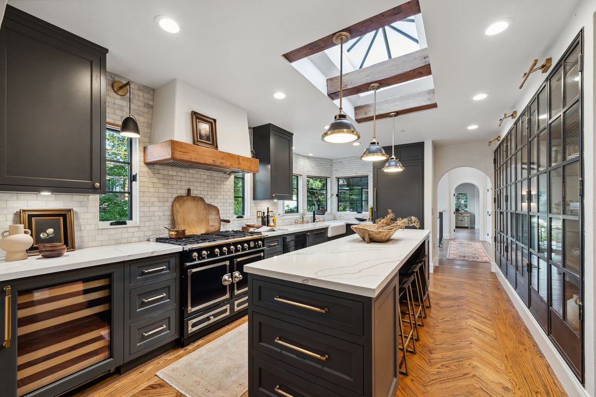The centerpiece of this Marin County home is its gourmet chef’s kitchen, featuring a La Cornue range/oven, a tumbled marble backsplash, and herringbone wood floors. The kitchen's vaulted skylight bathes the room in natural light, enhancing the elegant atmosphere. The home's extensive remodel includes a 1,350 sq ft addition and upgrades to the roof, windows, electrical, and HVAC systems, ensuring modern comfort in every corner.