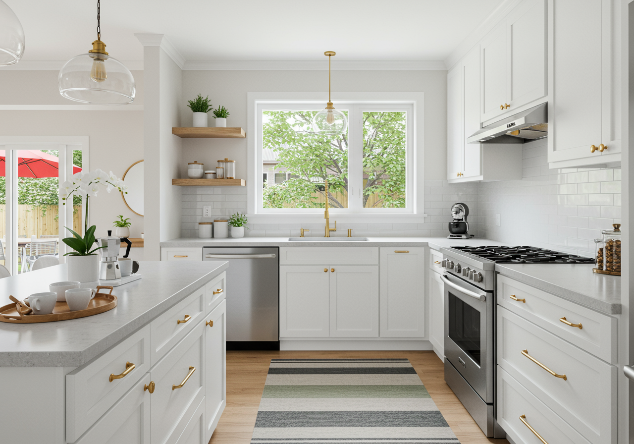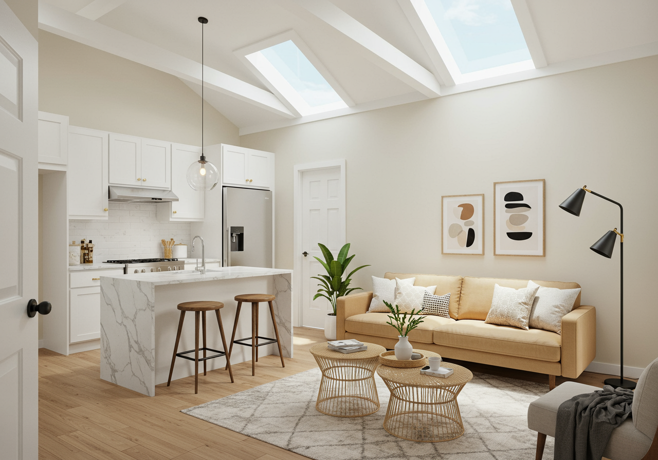 - A modern kitchen with stone countertops and an adjacent outdoor kitchen for al fresco dining.