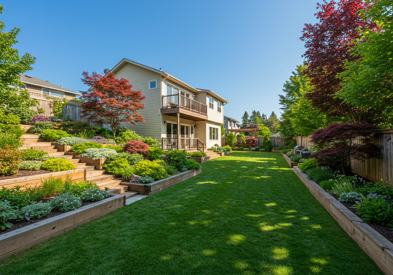 Adjacent to the kitchen and dining room, the family room serves as a perfect extension of the living space. It opens up to a sprawling backyard, a picturesque canvas painted with the hues of nature. The trellis-covered patio, expansive lawn, and deck offer an idyllic setting for outdoor entertainment or quiet reflection. Raised planting beds add a touch of greenery and provide an opportunity for gardening enthusiasts.