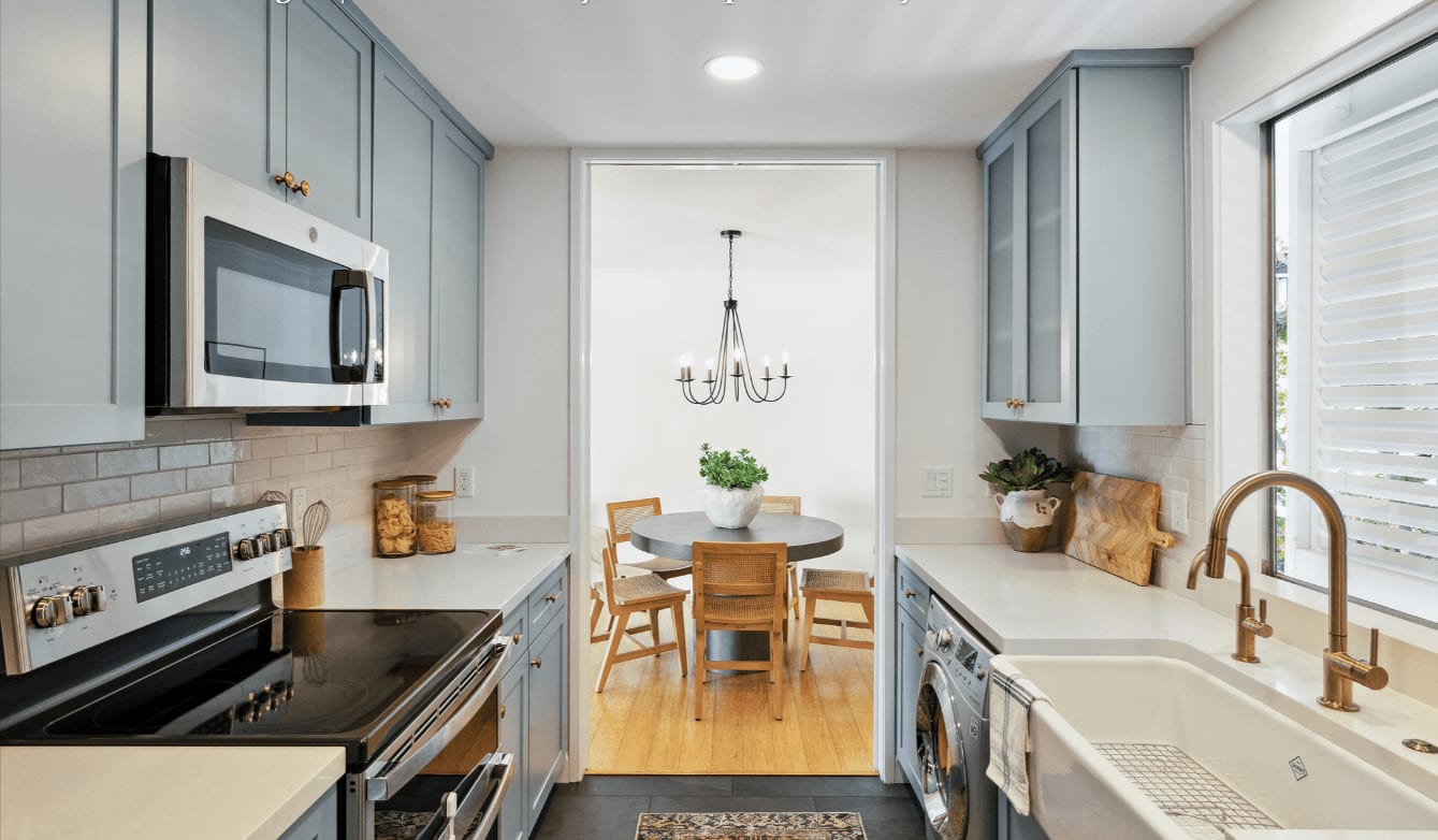 Step into a world of culinary delight in the fully remodeled kitchen. Featuring brand-new cabinetry adorned with luxurious gold hardware, a Shaws farmhouse sink, and a timeless subway tile backsplash, this kitchen is as beautiful as it is functional. The quartz countertops provide ample space for meal preparation, and top-tier appliances—including an LG refrigerator, Whirlpool dishwasher, and a 5-burner GE cooktop—ensure that every cooking experience is a joy.