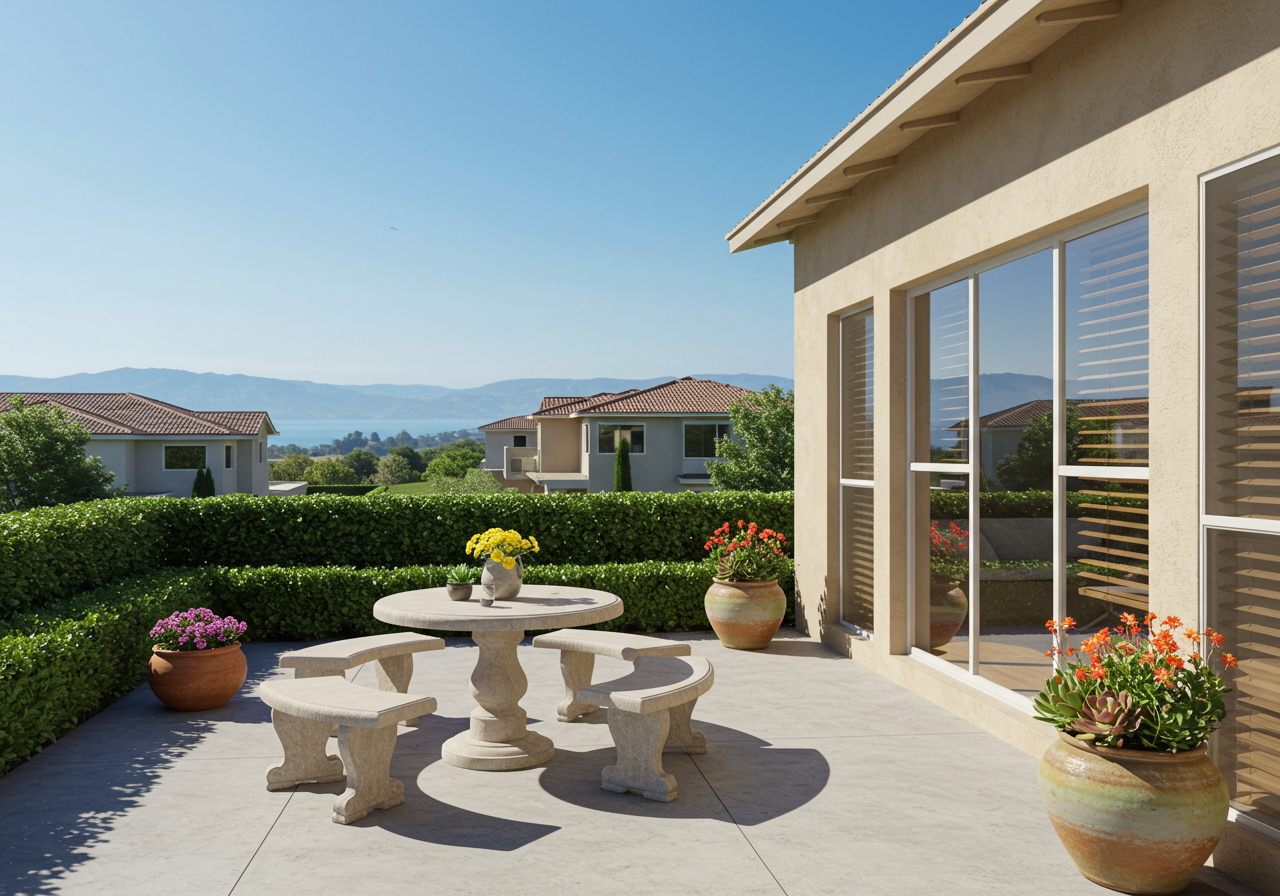 Privacy and tranquility define the home's outdoor spaces. The rear patio, influenced by Japanese design aesthetics, provides a peaceful retreat surrounded by a well-maintained fenced yard—perfect for families with children and pets.