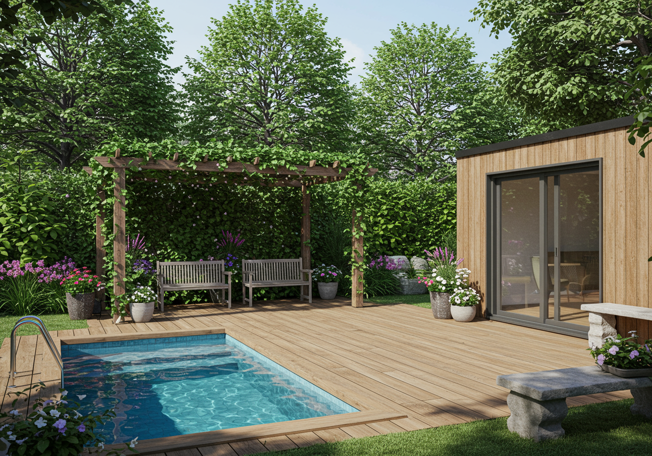 The guesthouse, imagined by designer Alex Riley, boasts two en-suite bedrooms with a living space and kitchenette, all situated on the property and made to feel like its own private oasis with a view of the custom-built redwood tree house.