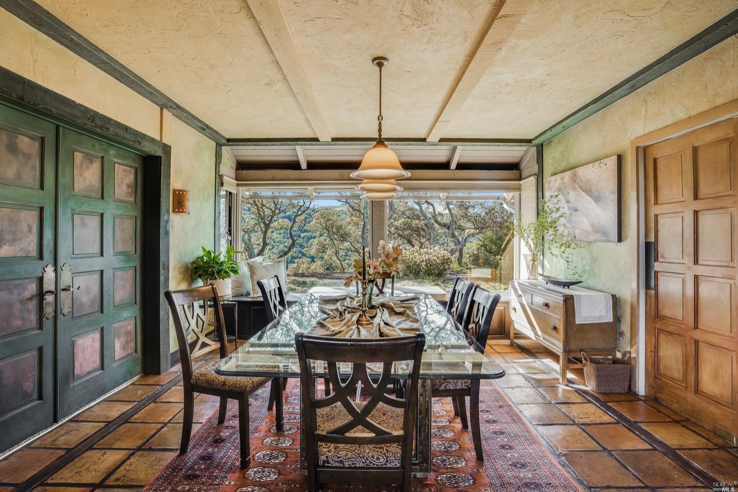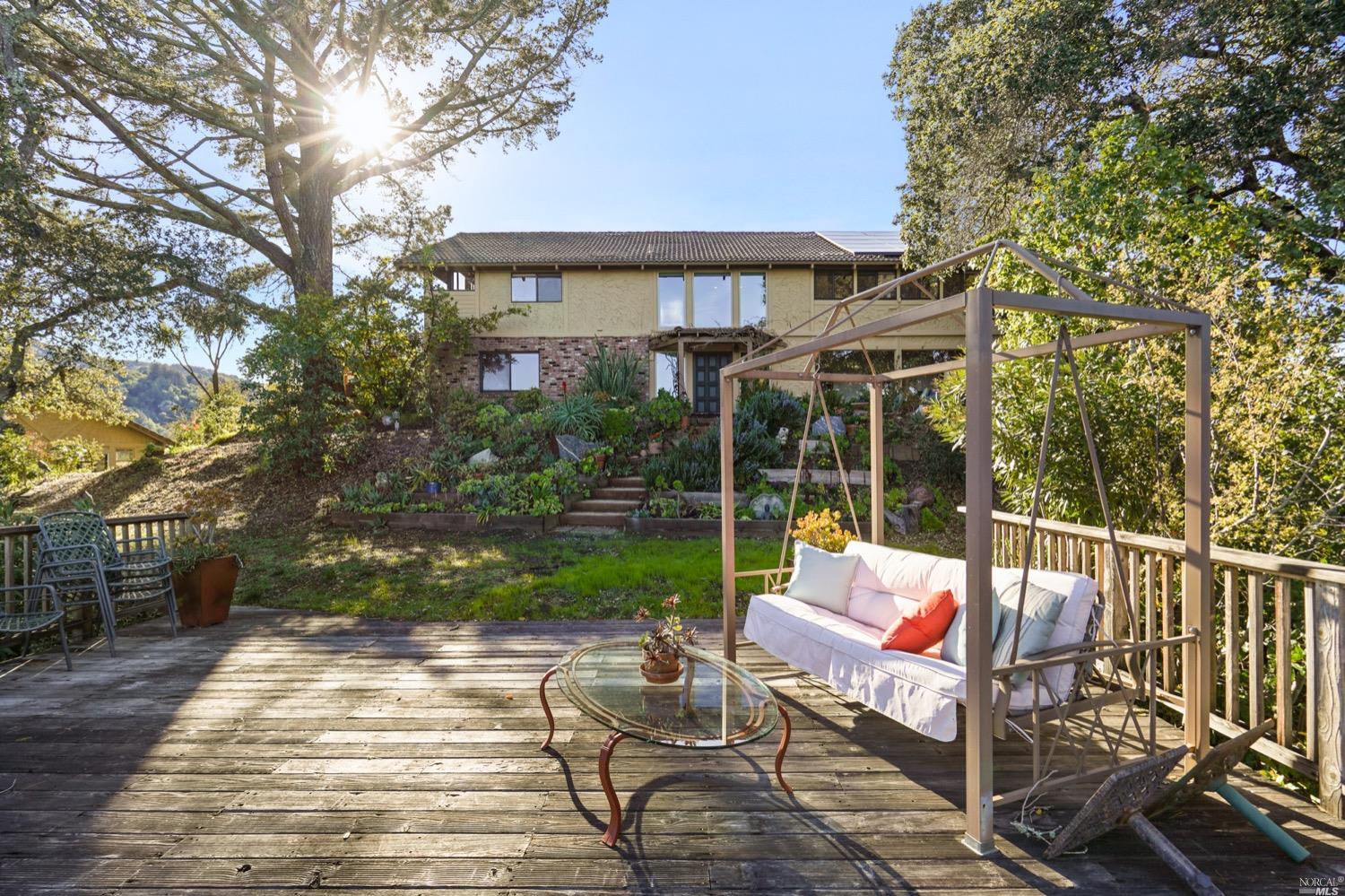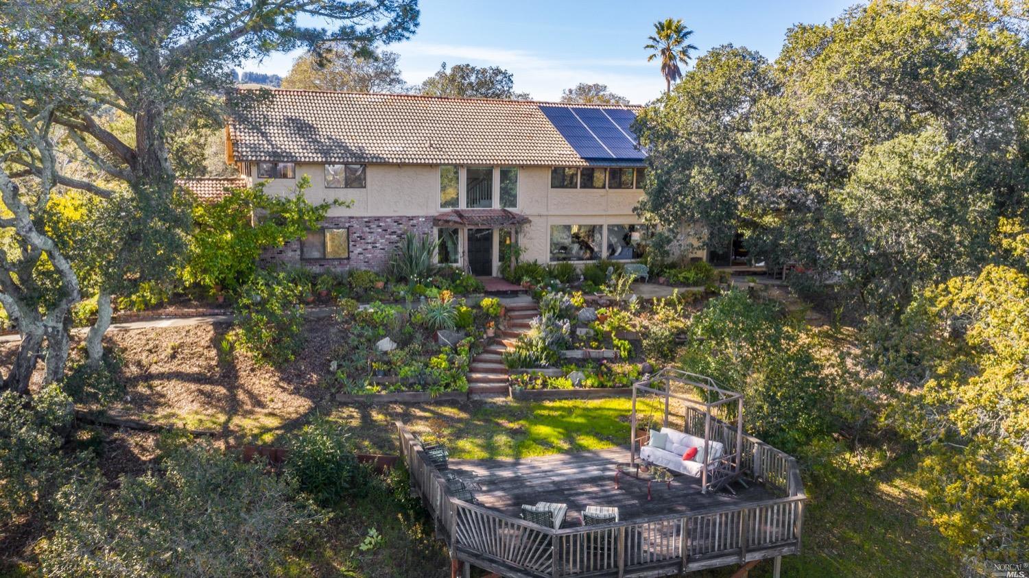 A magical and tranquil oasis. This is a one-of-a-kind ridge-top private estate with beautiful views of the bay, Mt. Diablo, valley, and surrounding hills. Its 13+ acres is the lush setting for this spacious home. Among its many features are a Great room with soaring open ceilings, a living room, a dining room, a large kitchen, laundry, 2 large primary suites, 3 other bedrooms, and 4 baths. The landscaped, low maintenance grounds with a large pool and spa solar heated, and additional sites provide plenty of space to create, relax, unwind, and enjoy the beauty and serenity of nature and the expansive vistas. The garage building was expanded with three additional rooms great for offices, studios, or a gym. Across its privately maintained road are its large meadow, gardens, greenhouse frame, & tiny studio(utility free). This has been home to a great family of friends who has loved and cared for it for many years. It is ideal for multi-use or single family. An abundance of parking near houses or in the meadow.