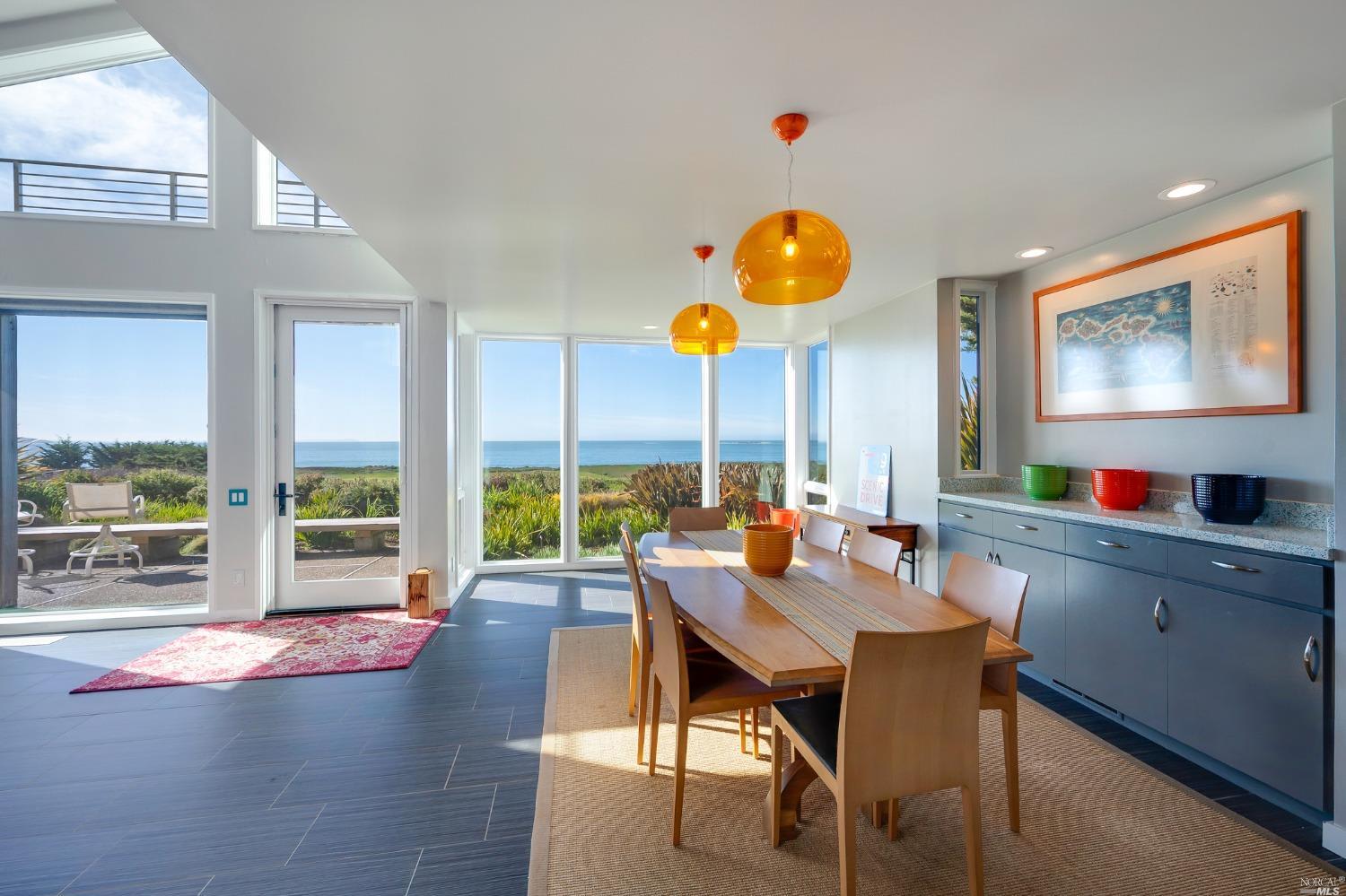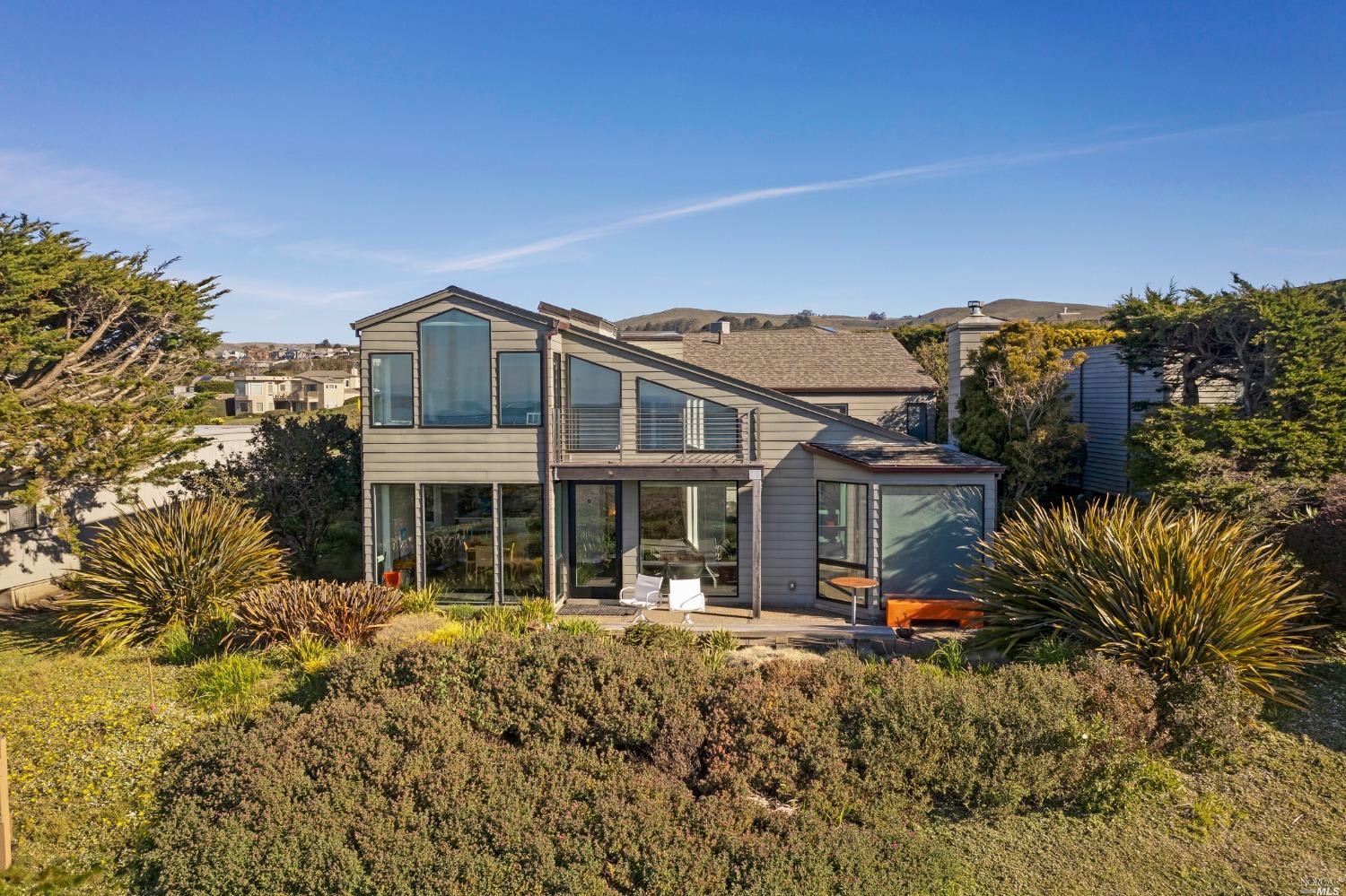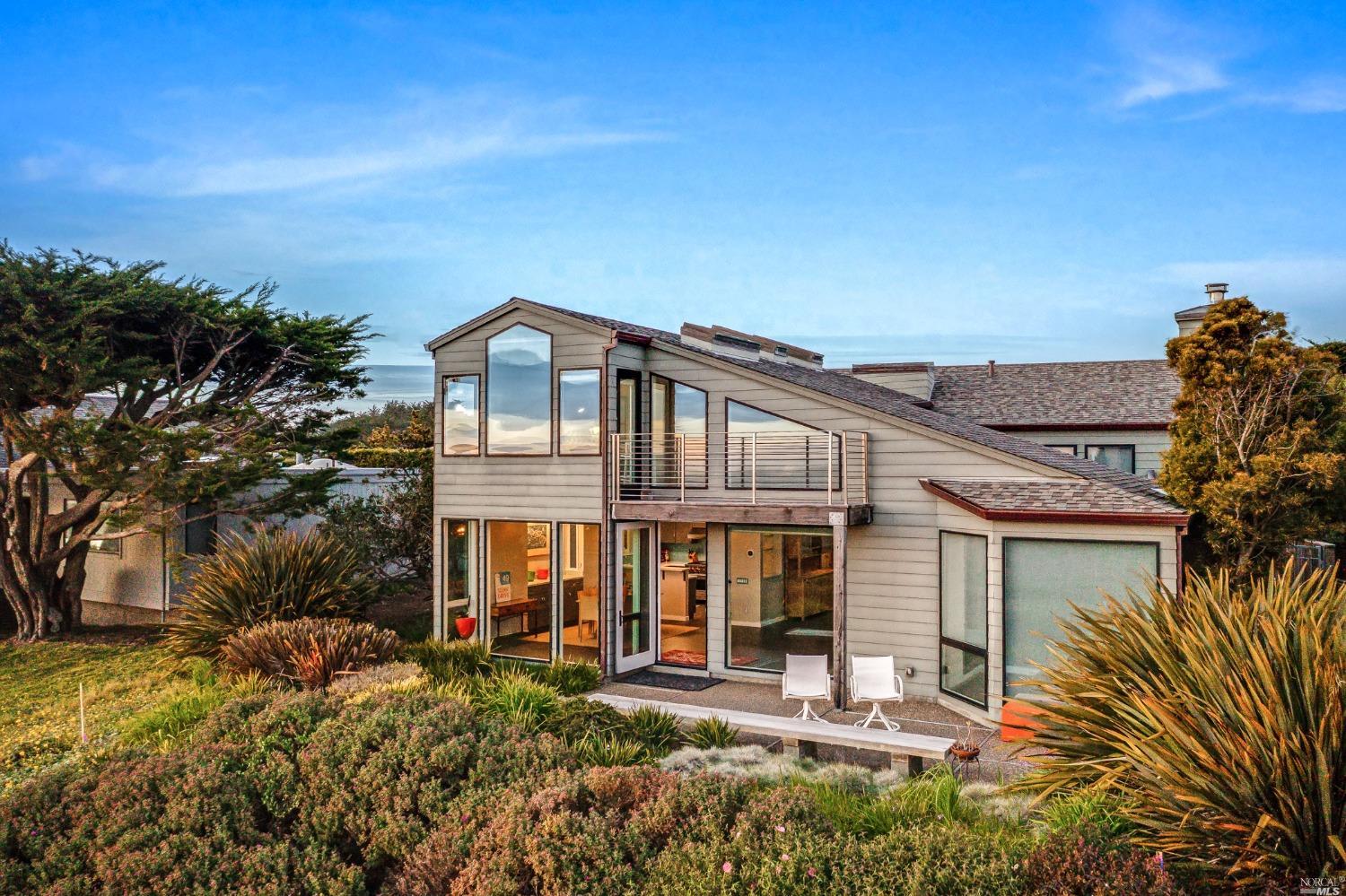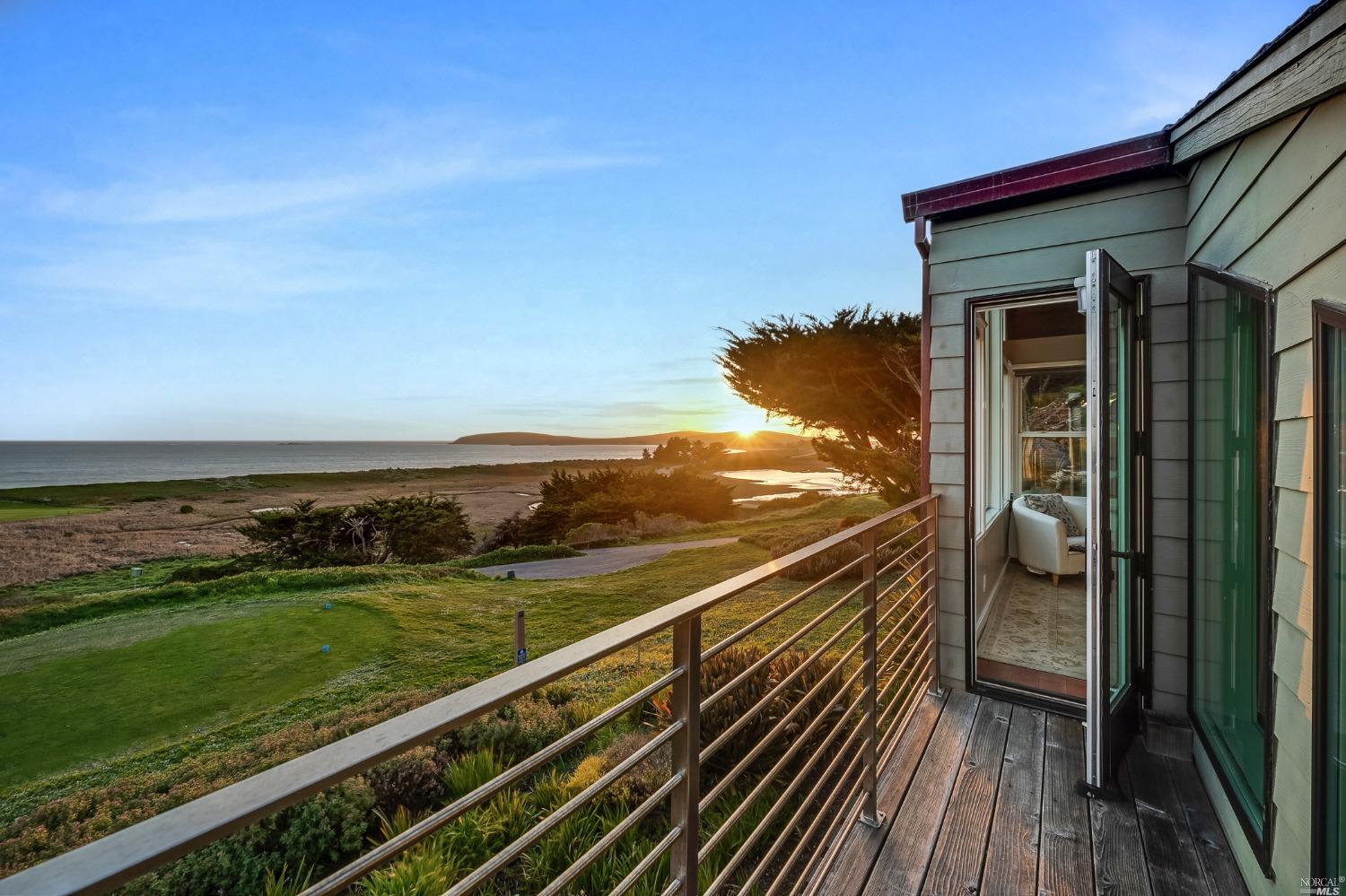 Stunning frontline views overlooking the 18th fairway to the waves on Doran Beach and breathtaking sunsets over Bodega Headlands. This beautiful, fully-remodeled home has easy access to nearby beach trails and clubhouse. On the main level, the bright and airy great room provides ample space to entertain guests after preparing meals in the spacious kitchen finished with top-of-the-line appliances throughout, including a Wolf gas range, Sub-Zero Pro refrigerator and wine refrigerator. The entertainment continues directly out to the lower deck with plenty of space to relax while taking in the endless views. Adjacent to the kitchen is a walk-in food pantry/utility room, coffee station and plenty of storage. From the great room you can access a large, wind-protected courtyard for a barbecue and private hot tub. The upstairs primary suite, with warm hardwood floors takes full advantage of unending vistas via a wall of windows and its own private deck. And, two guest rooms share the views and are served by a full-sized bathroom with a glass tiled tub/shower combo. Take advantage of all the amenities Bodega Harbour has to offer, including the Bluewater Lounge restaurant and bar, full gym, heated pool, sauna, tennis courts, sports court, bocce court, playground and easy beach access. Rear of the home with reflections of the Pacific Ocean. The 18th fairway is below with Doran Beach just 300 yards behind.