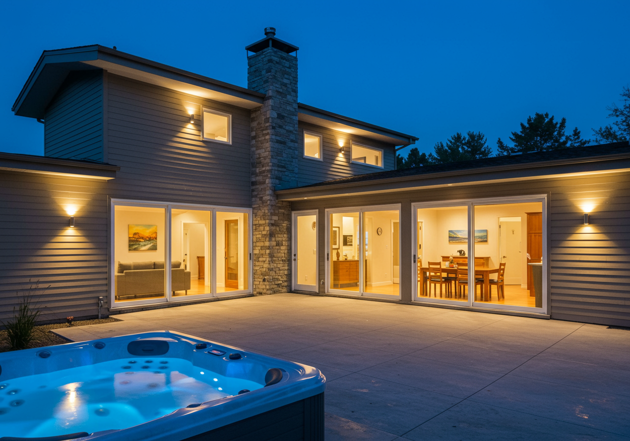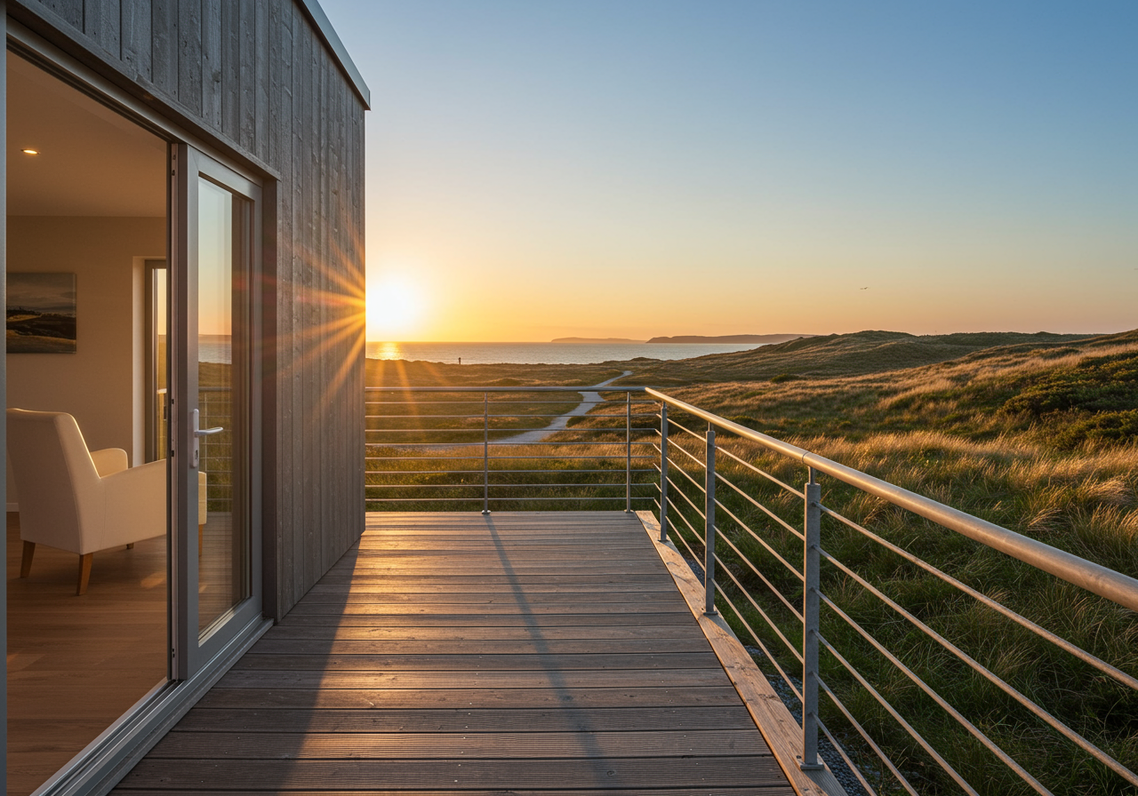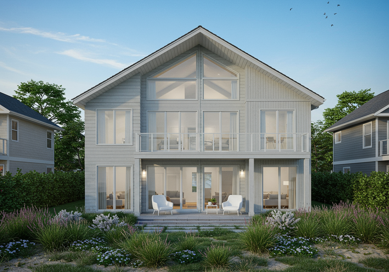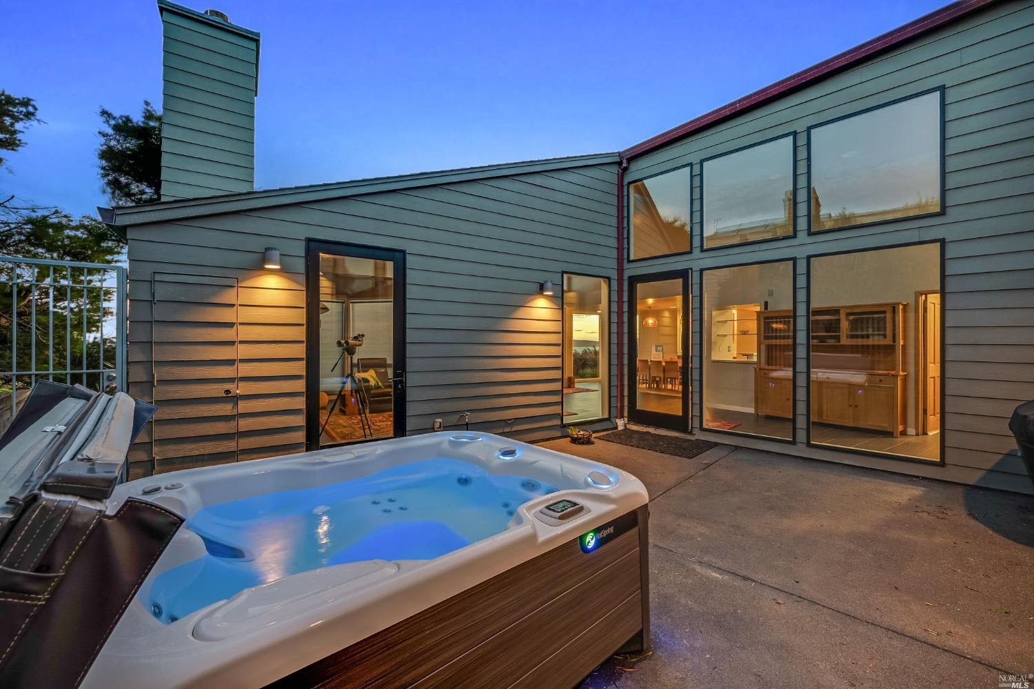 Stunning frontline views overlooking the 18th fairway to the waves on Doran Beach and breathtaking sunsets over Bodega Headlands. This beautiful, fully-remodeled home has easy access to nearby beach trails and clubhouse. On the main level, the bright and airy great room provides ample space to entertain guests after preparing meals in the spacious kitchen finished with top-of-the-line appliances throughout, including a Wolf gas range, Sub-Zero Pro refrigerator and wine refrigerator. The entertainment continues directly out to the lower deck with plenty of space to relax while taking in the endless views. Adjacent to the kitchen is a walk-in food pantry/utility room, coffee station and plenty of storage. From the great room you can access a large, wind-protected courtyard for a barbecue and private hot tub. The upstairs primary suite, with warm hardwood floors takes full advantage of unending vistas via a wall of windows and its own private deck. And, two guest rooms share the views and are served by a full-sized bathroom with a glass tiled tub/shower combo. Take advantage of all the amenities Bodega Harbour has to offer, including the Bluewater Lounge restaurant and bar, full gym, heated pool, sauna, tennis courts, sports court, bocce court, playground and easy beach access. Rear of the home with reflections of the Pacific Ocean. The 18th fairway is below with Doran Beach just 300 yards behind.