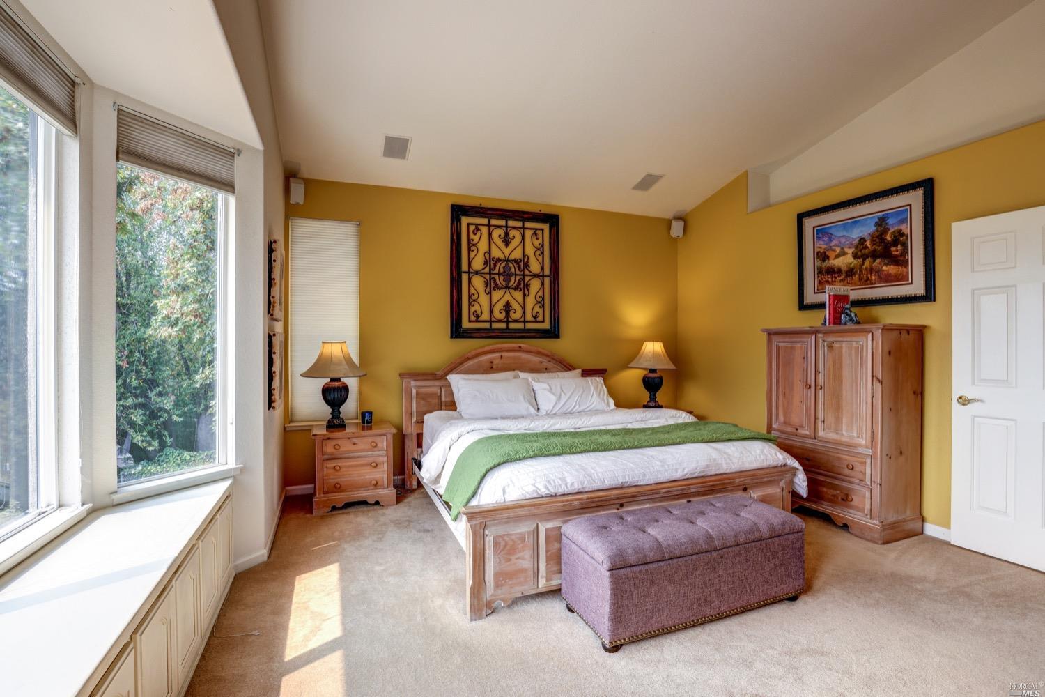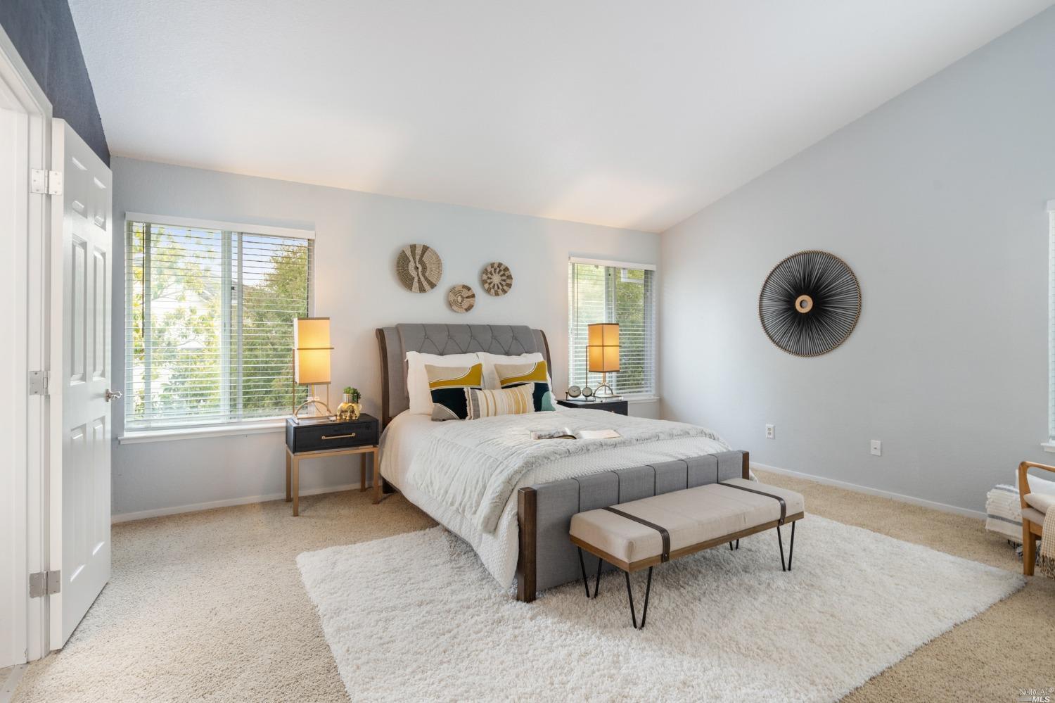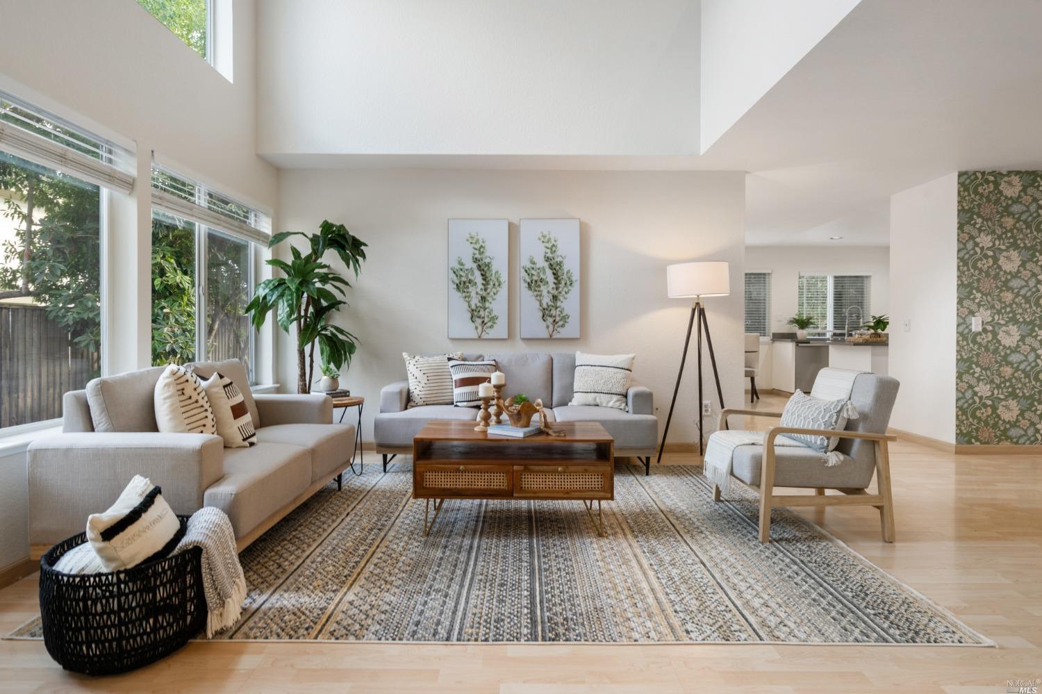 Check off every item on your wishlist in this light, bright home offering the commuter's dream location just 35 minutes to the Golden Gate Bridge and 20 minutes to downtown Sonoma. Nestled on a closed loop street, the level backyard is paved with stamped concrete, offering plenty of options for outdoor seating, grilling, dining and entertaining. Inside you'll find soaring vaulted ceilings, gleaming laminate flooring, cozy fireplace, updated fixtures and finishes throughout. Rare five-bedroom floorplan with one room and full bath downstairs, perfect for multi-generational households, enhanced accessibility, or private guest quarters. Open kitchen features center island, stainless steel appliances, and plenty of cabinet and counter space. Primary suite features cathedral ceiling, walk-in closet, en suite bath with double-sink vanity and separate tub and shower. Double-bay garage offers added convenience. Ideal location close to bike and walking trails, parks, greenspaces, thoroug