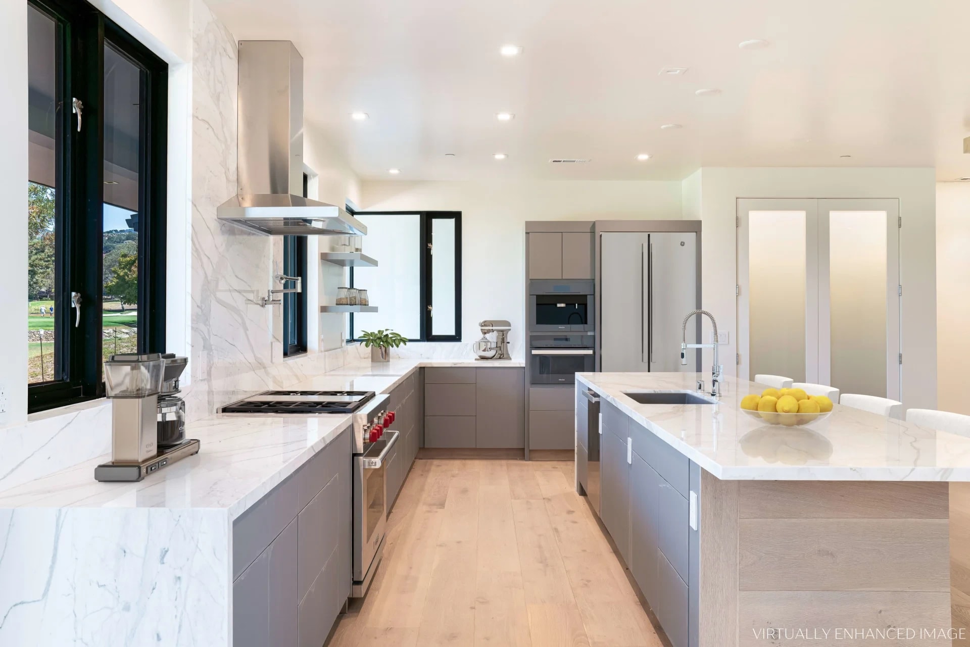 The interior includes a large-scale Great Room that opens to the fairway, featuring a wood barrel ceiling, two-way fireplace, and floating white ledger stone accent wall. The Kitchen and bathrooms boast Calacatta Gold Marble, Rohl plumbing fixtures, and custom cabinets.