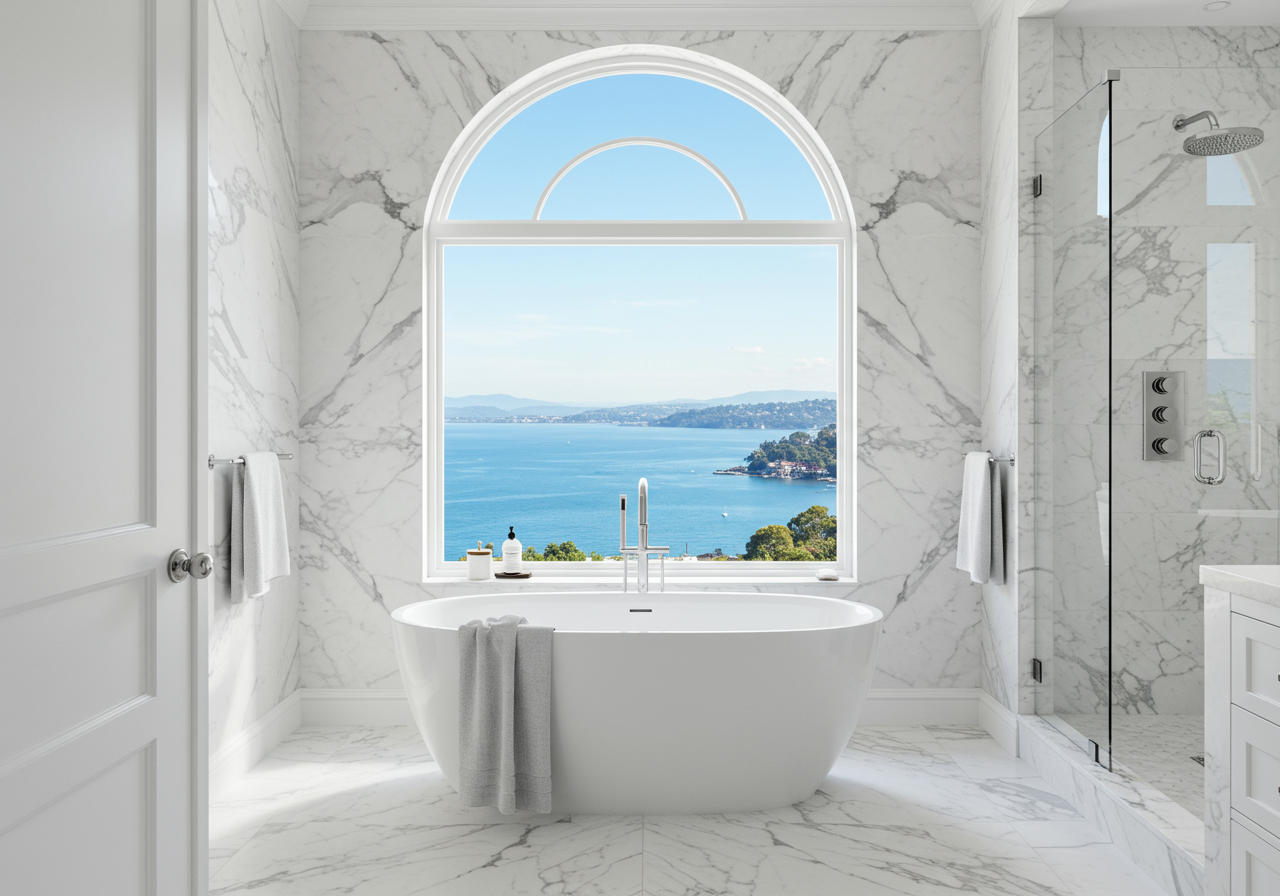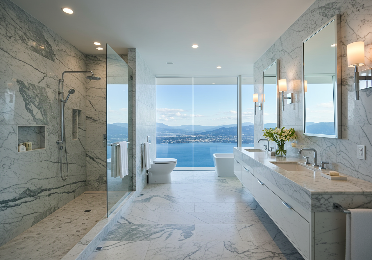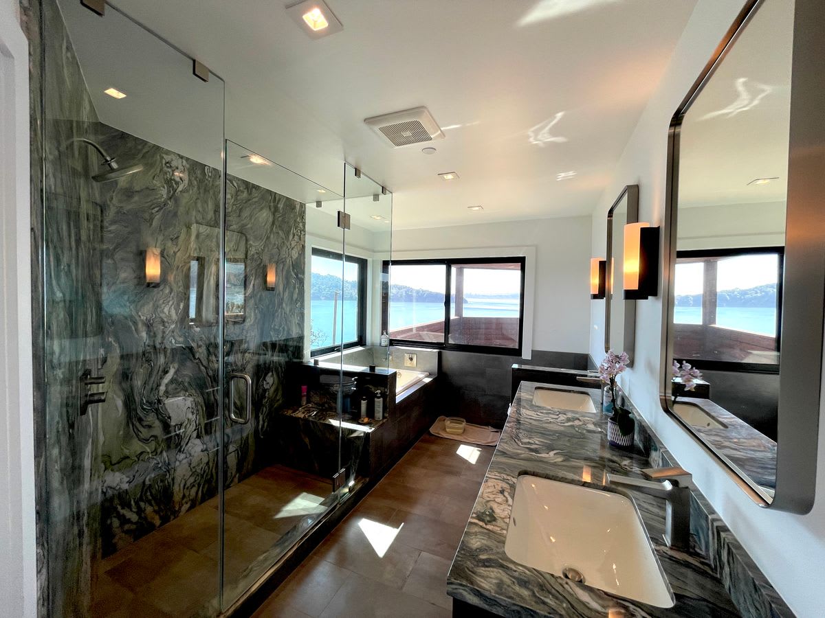 - Recently renovated primary bath w/ custom view shower, soaking tub, dual vanities, and Calacatta Borghini marble