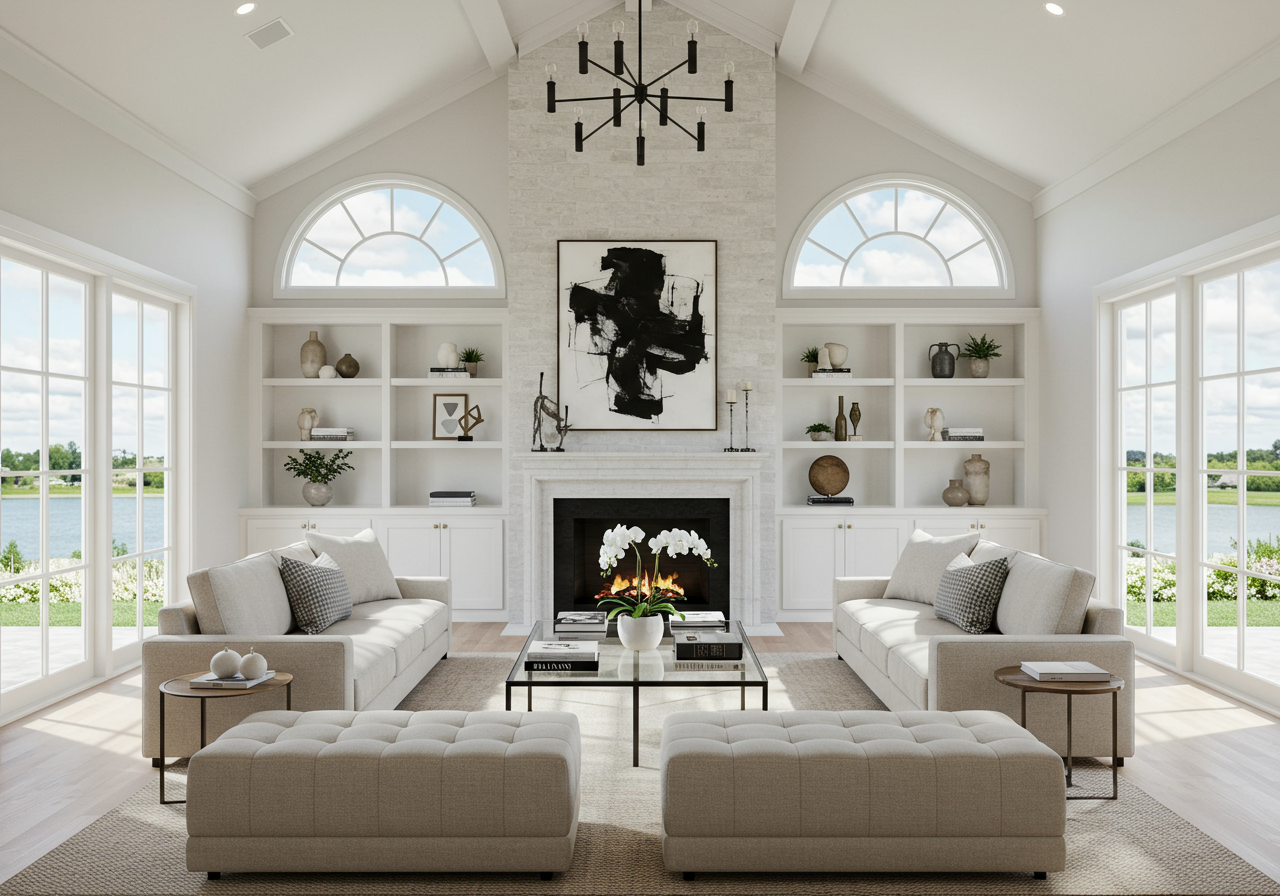 Tall walls of glass and multiple French doors lead out to the resort-like grounds for seamless indoor-outdoor living and entertaining. The kitchen is newly renovated and connects to two separate family rooms and outdoor patios, while the grand-scale great room opens directly to outdoor patios, decks, a lush-level lawn, a boat dock, and a mature garden with fruit trees.