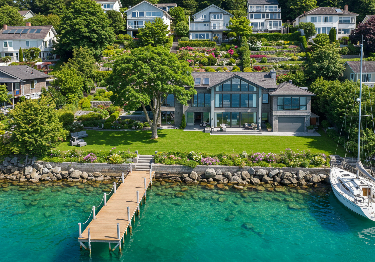 Perfectly site placed on a +-7,420 square foot lot, this newly renovated +-4,055 square foot mid-century modern shingle style waterfront residence shows beautifully with grand scale large rooms and soaring +-10 foot ceilings throughout. The luxurious master suite is located on the main level with a walk-in closet fit for Coco Chanel. Two spacious additional bedrooms are located on a separate wing of the main level, and a fourth oversized bedroom on the upper level is perfect for a workplace or, game room.