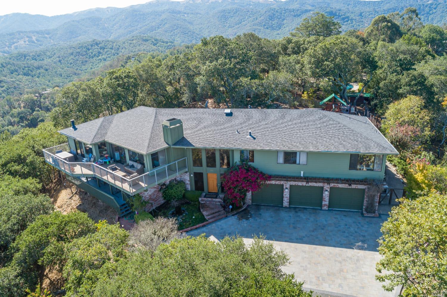 Beautifully situated on a sunny ridge, this home offers a grand-scale open floor plan, stylish contemporary detailing, and sweeping views. With various indoor-outdoor connections, this home provides multi-use functionality and is great for entertaining. The spacious entry takes you to the family room, living room, dining room, and open remodeled kitchen, all showcased by dramatic picture windows. The thoughtful floor plan offers three bedrooms on the same level; a spacious primary ensuite with a recently remodeled bath, walk-in closet, two bedrooms, and a second remodeled full bath and laundry room. On the lower level is the fourth bedroom, full bath along with a newly added kitchen, making this a lovely in-law option with a separate entrance. The home overlooks a multi-level yard with generous gardens, space for entertaining, and flat play areas on an acre+ lot. Solar-owned, A/C, three-car garage, EV outlet, and spa. Quick drive to shopping, schools, and Highway 101.