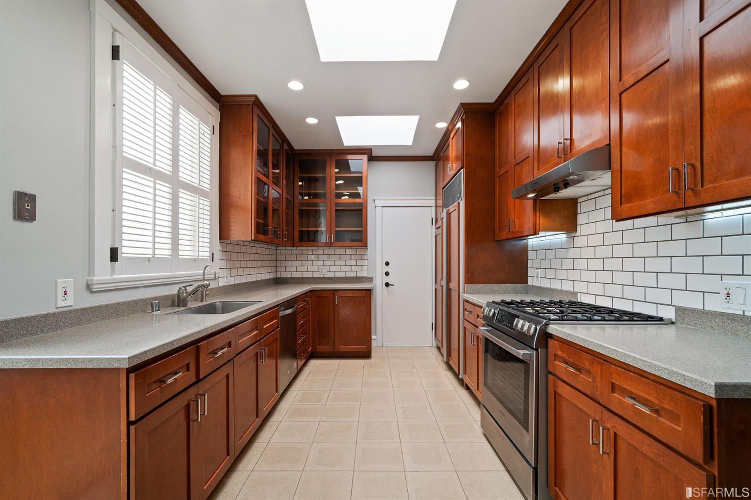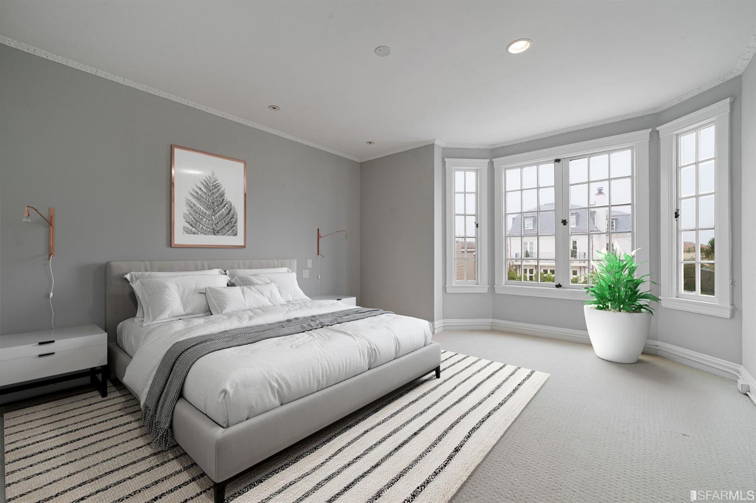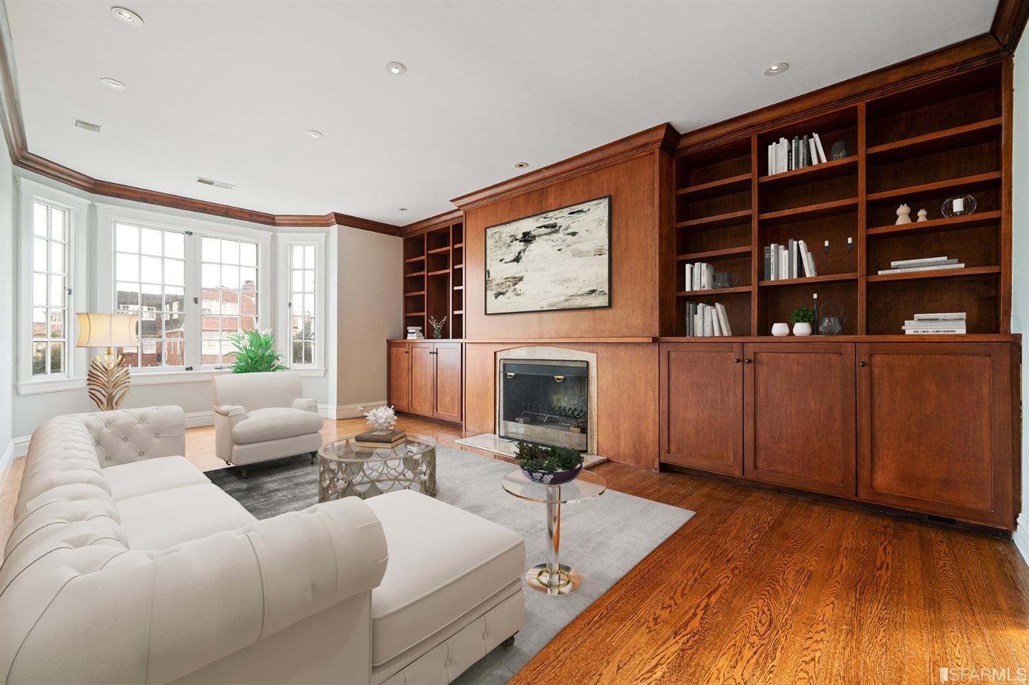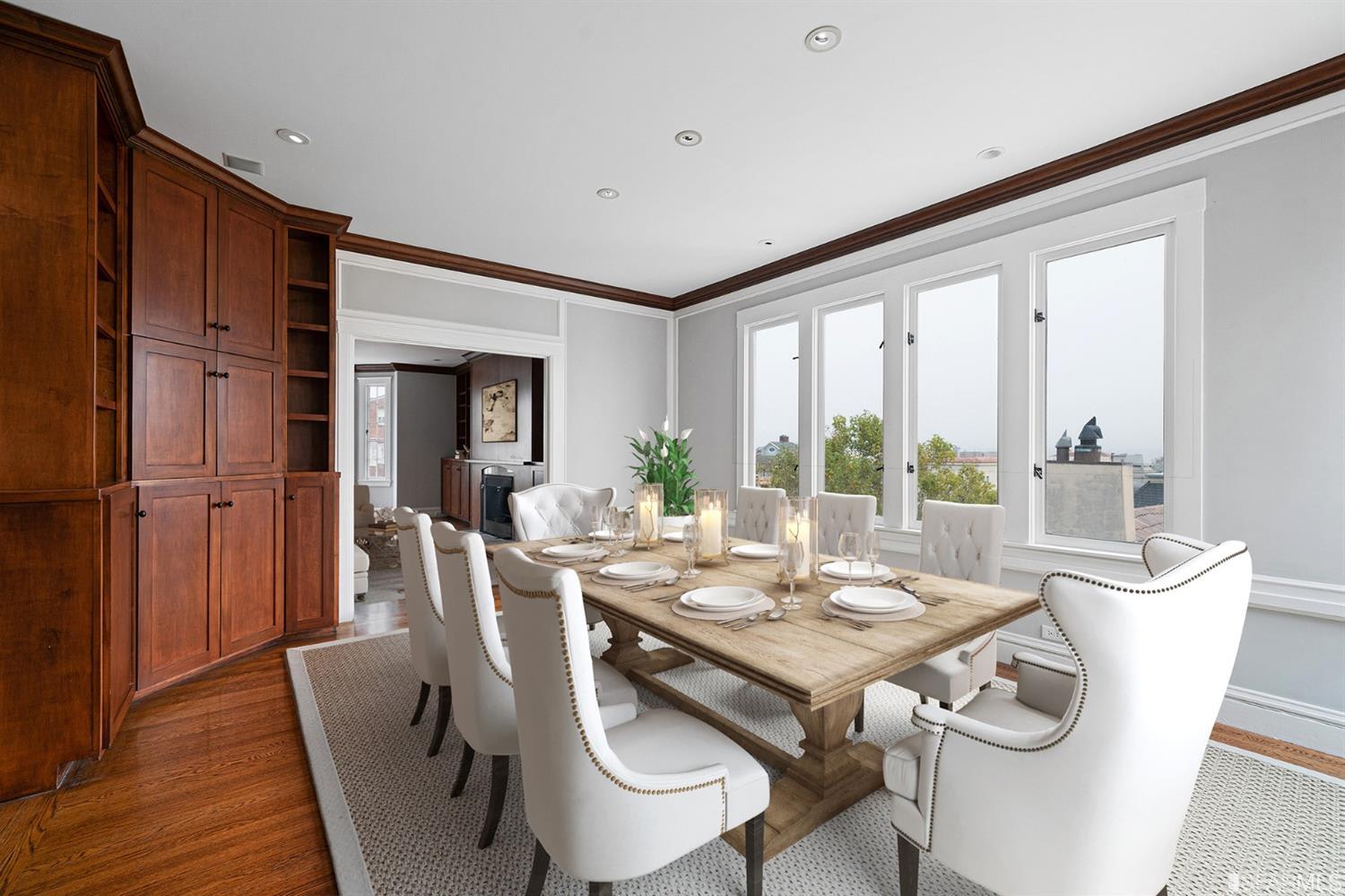 Located on a prime block in San Francisco's Pacific Heights neighborhood, this stately 4-bedroom, 2.5-bath penthouse condominium offers fantastic natural light and a house-like feel. The entry leads into a wide hall with public rooms to the east and bedrooms to the west. An expansive kitchen includes a sunny breakfast nook and is adjacent to a large dining room with a view of the Downtown skyline. The formal living room lies beyond the dining room and includes northern outlooks from beautiful bay windows and a lovely fireplace. There are 3 large bedrooms and one smaller bedroom that's perfect for use as an office. The primary bedroom has an en-suite bath and bay windows. Highlights include in-unit laundry, abundant closets, wood floors, recessed lights, 1-car parking, a massive private storage room with a wine cellar, and a well-maintained, 5-unit homeowners' association. The residence is located just steps from the Presidio, and the amenities of Union, Sacramento, and Fillmore Streets.
