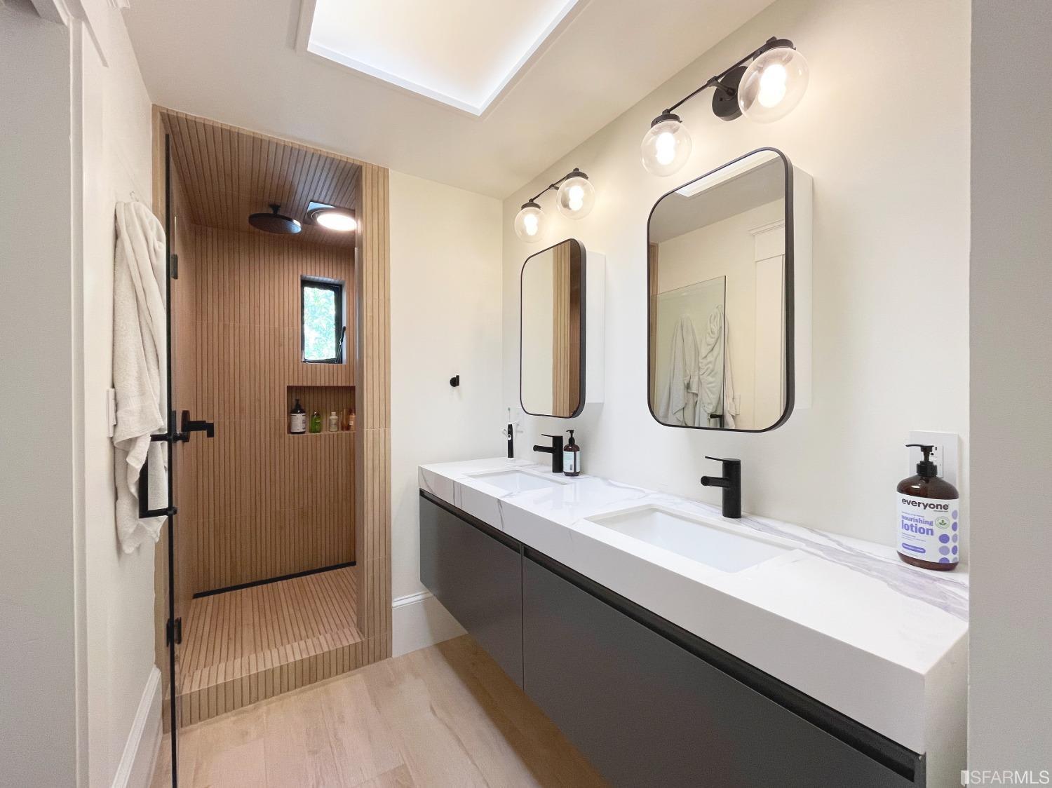 Escape the city bustle in the comforts of this remodeled home on tranquil Lake Street. Greeted by a bright living room, the generous open space with parquet hardwood leads into a formal dining room. Connected is a remodeled kitchen with sleek appliances and ample cabinetry, flush with natural light through the sliding glass door that opens to an expansive deck overlooking the low-maintenance, landscaped yard with new turf and space for a horizontal extension. Upstairs hosts 3 spacious bedrooms with high ceilings. The primary bedroom suite features a newly remodeled bath with a skylight, double vanity, and a custom-built cedar shower designed to unwind. This well-appointed suite also includes a walk-in closet with custom shelves. The 2 additional bedrooms share a full bathroom with a tub, double vanity, and built-in storage. The tandem garage could potentially fit two compact cars to complete this home, and the garage has plenty of room for storage and possible addition. Some photos are virtually staged.