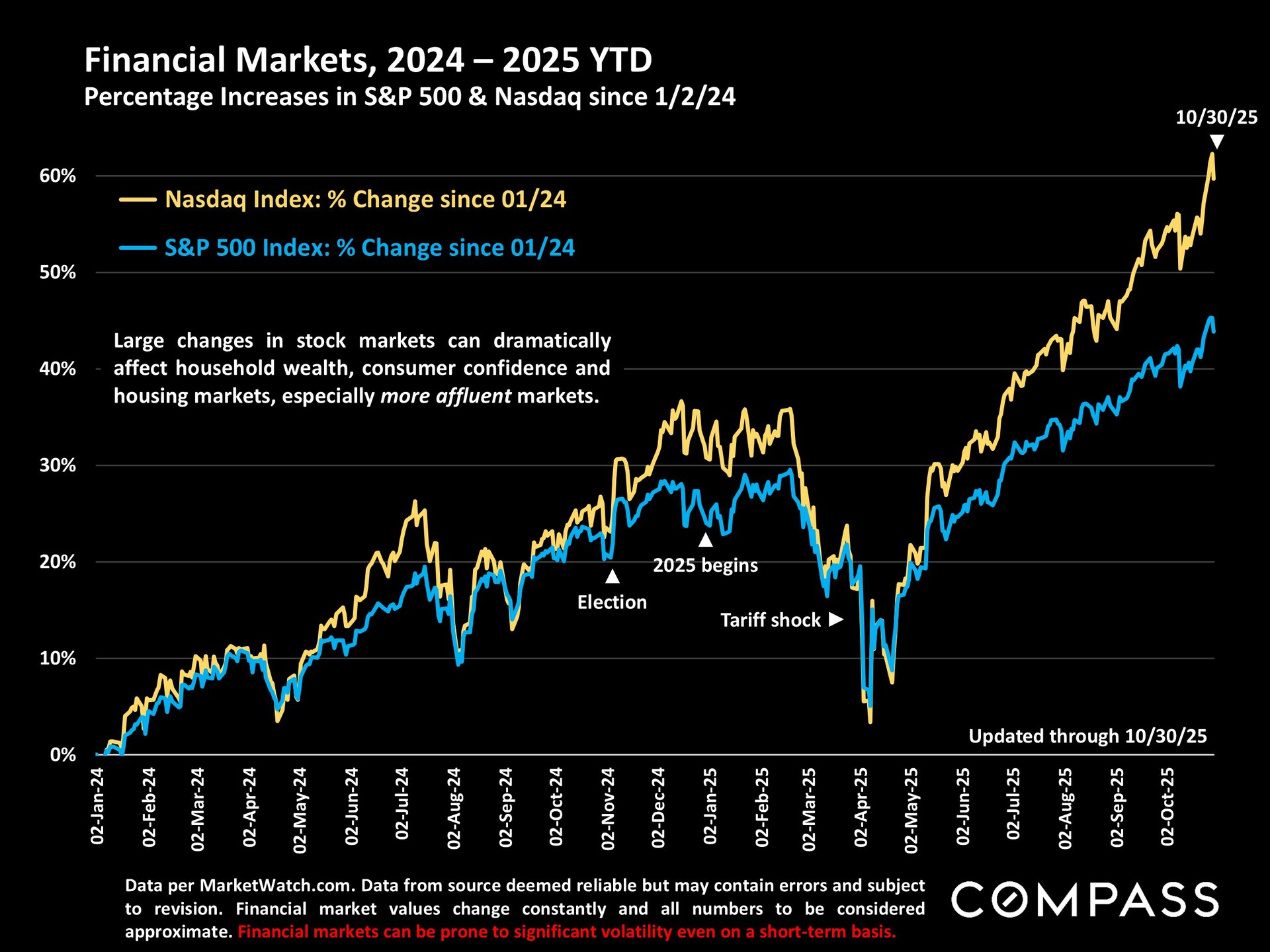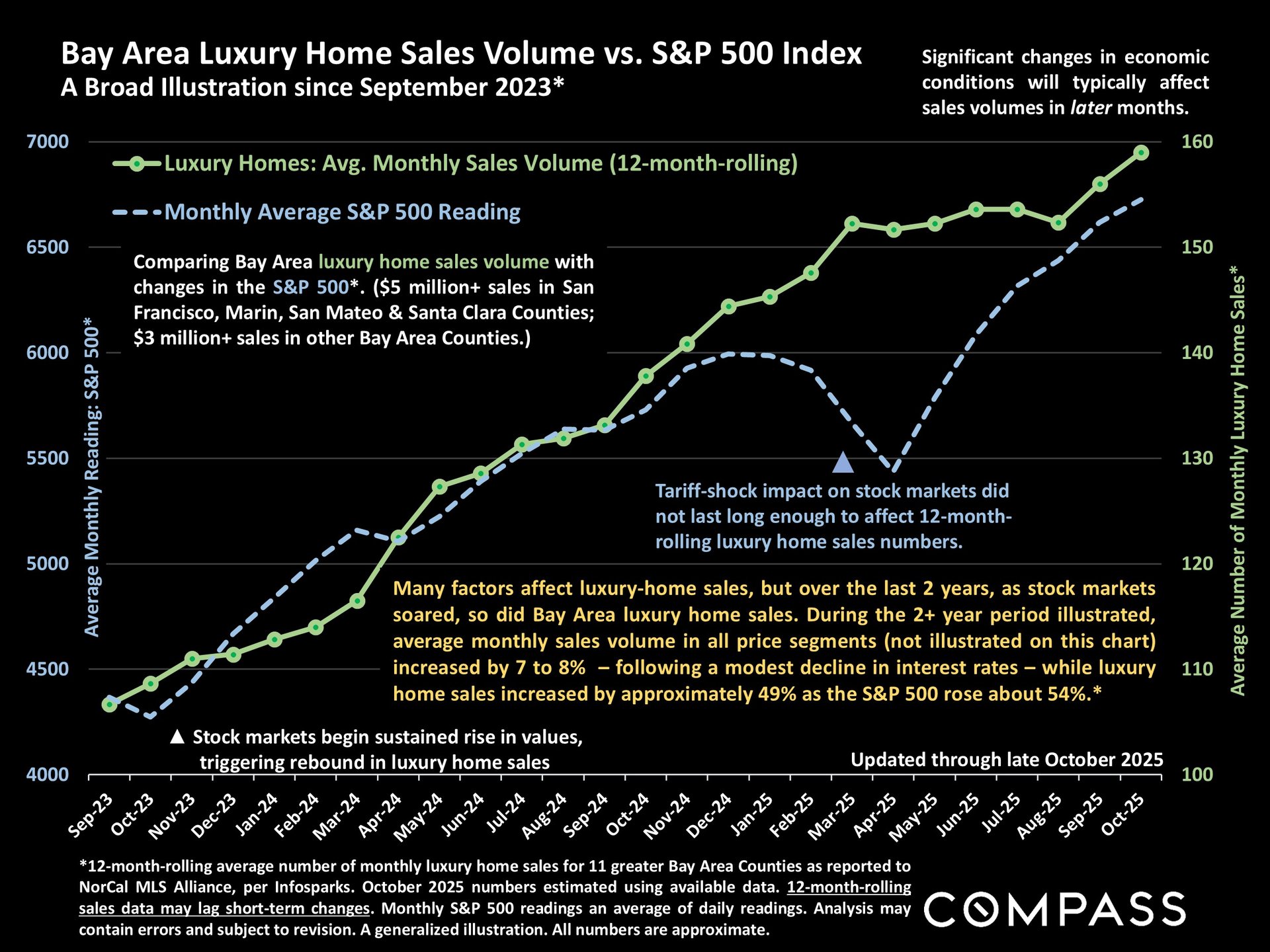 A broad overview comparing changes in the S&P 500 Index to Bay Area luxury home sales volume, since stock markets began their huge rebound in late 2023.