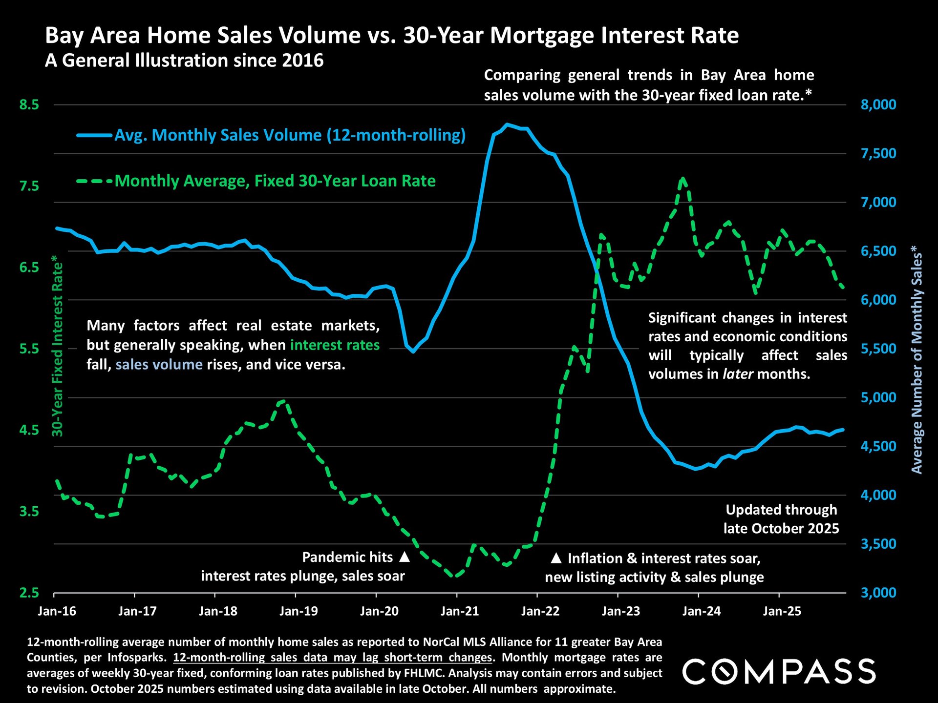 A broad overview comparing 30-year mortgage interest rates to Bay Area sales volume since 2016. Sales have been gradually increasing since bottoming out in 2023 - as interest rates have generally declined from their 2023 peak.