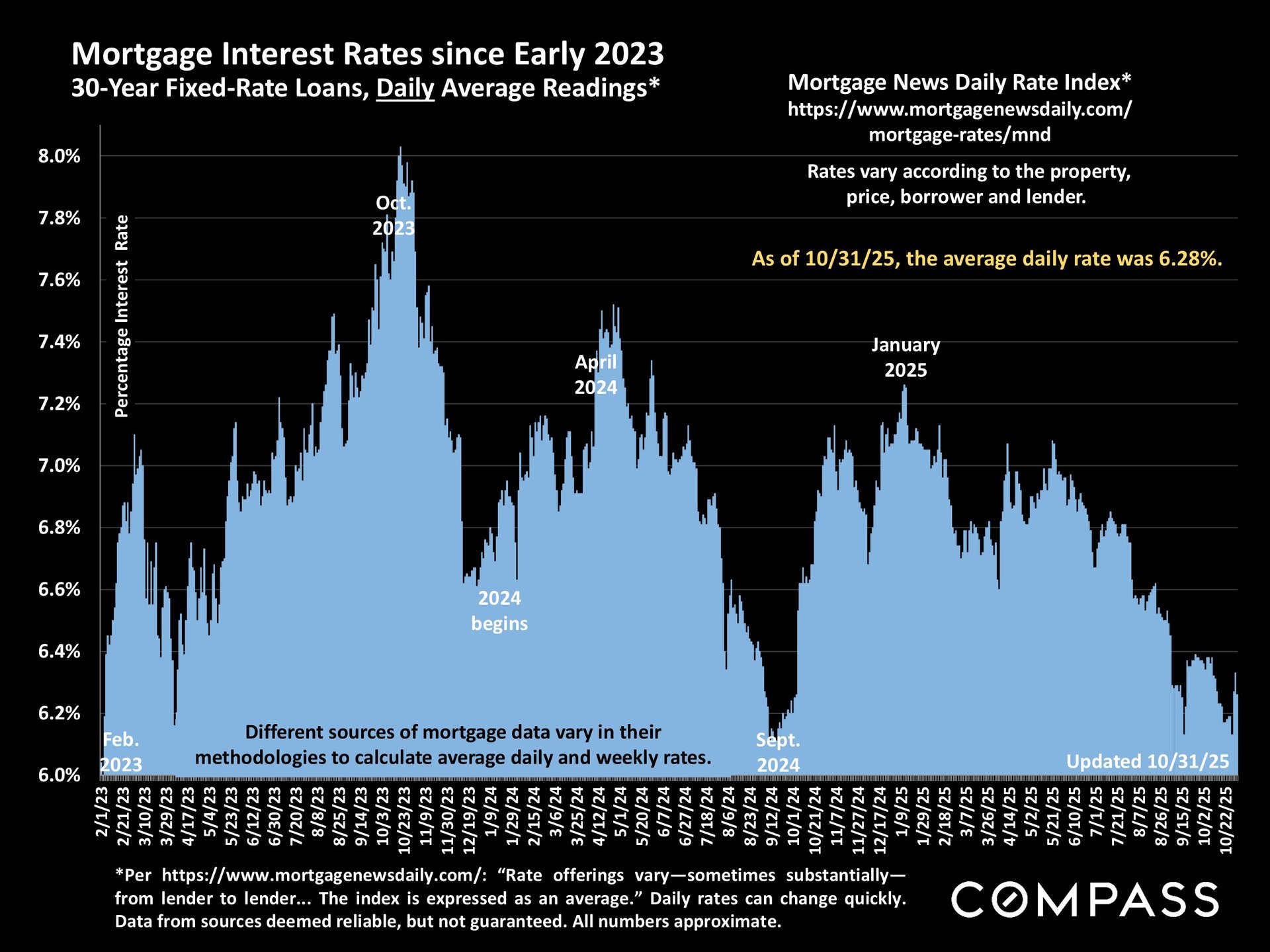 The weekly average interest rate (1st chart below) released yesterday ticked down very slightly. The daily average interest rate (2nd chart) has risen in the last 3 days after hitting its recent low point on 10/28.