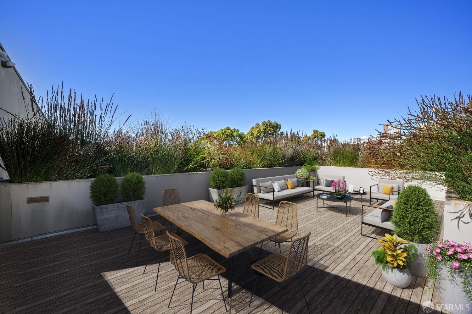 The spacious living room, complete with a custom-designed media center, seamlessly flows onto a private rooftop deck. This lushly surrounded outdoor space, over 400 square feet, offers breathtaking views of the city skyline and the iconic Sutro Tower, making it an ideal spot for enjoying San Francisco's famed indoor/outdoor lifestyle year-round.