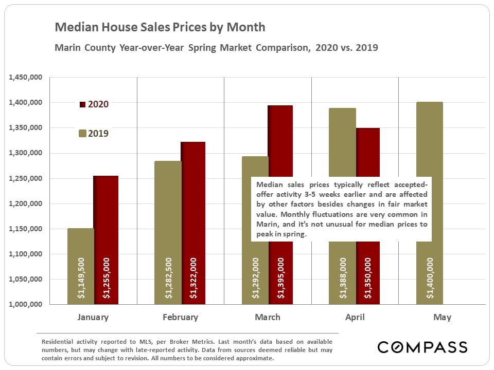 Though the Marin April median house price declined a little year over year (after 3 months of increases), too much should not be made of one month’s data – Marin’s monthly median sales price often fluctuates without great meaningfulness.