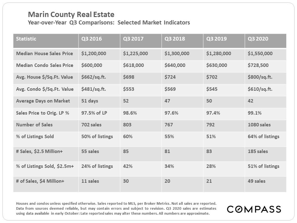 The table below compares Q3 statistics across 5 years. The huge jump in the median house sales price will be discussed further later in the report.