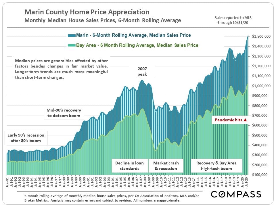 The long-term median sales price chart below is similar to those for counties around the Bay Area - a significant spike in median house prices since the pandemic struck in early spring. However, Marin has seen a more dramatic increase than most.