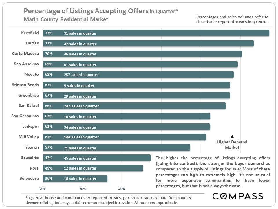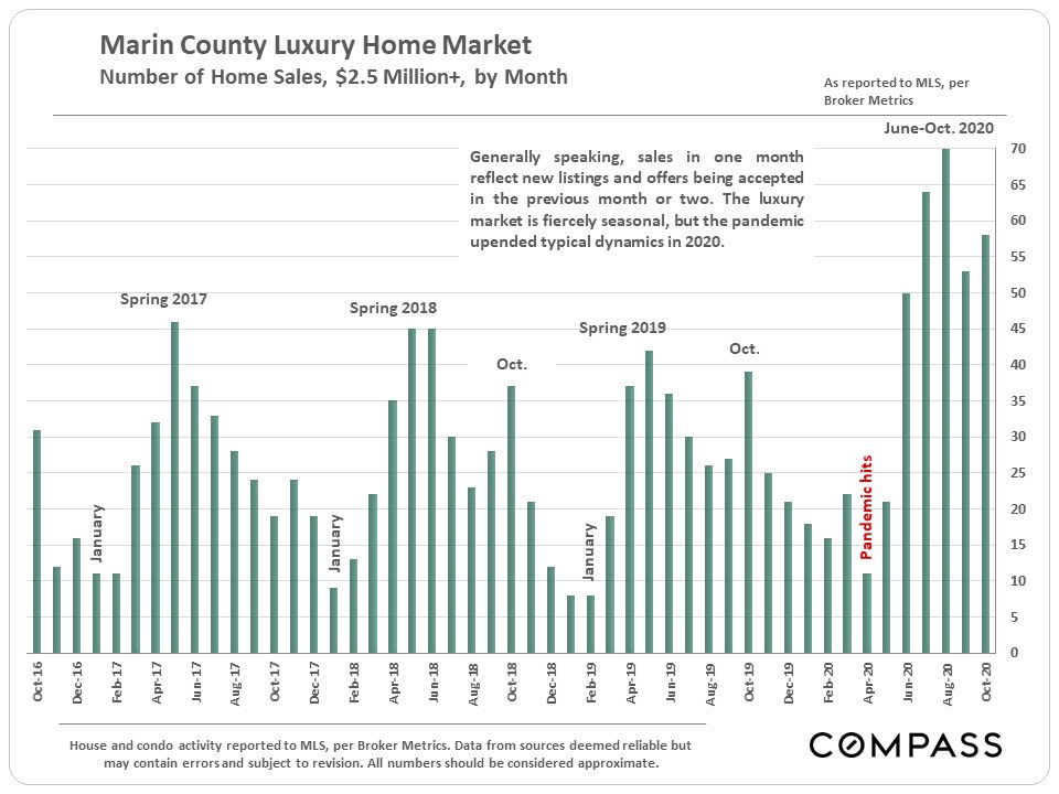 This year, the pandemic upended seasonality: Spring, usually the strongest selling season, saw a crash in activity; summer, which typically slows down - especially for luxury home sales - saw extremely high demand, particularly at the high end. However, some counties, including Marin, were impacted - usually only temporarily - by the terrible fires.