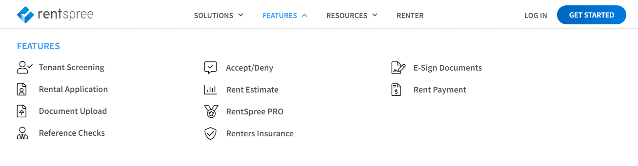 Key features of Rentspree are Online Rental Application, TransUnion Credit Report, Criminal background check, Eviction History Report, Acceptance/Denial Letters, E-Signatures.