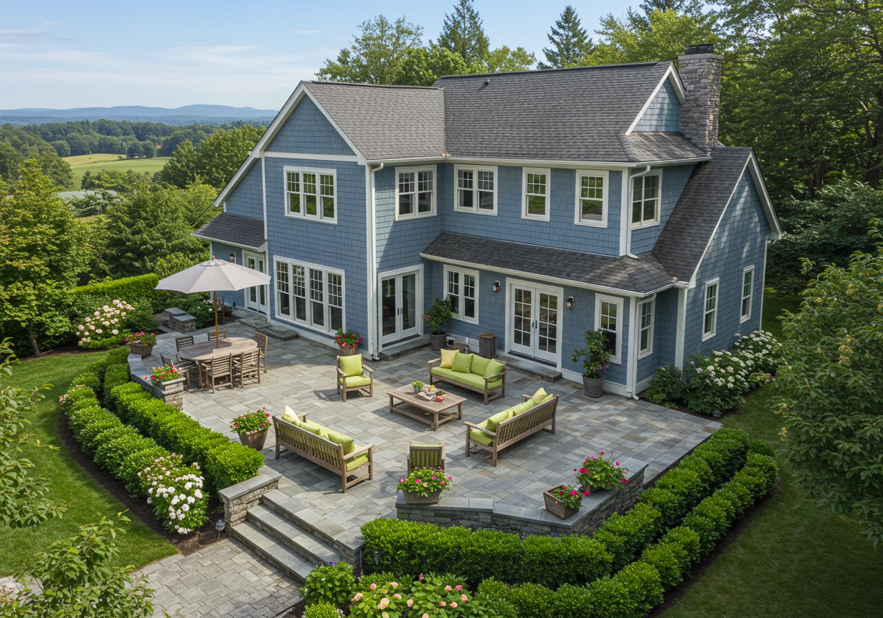 - Inviting stone patios, complemented by mature trees and lush plantings.