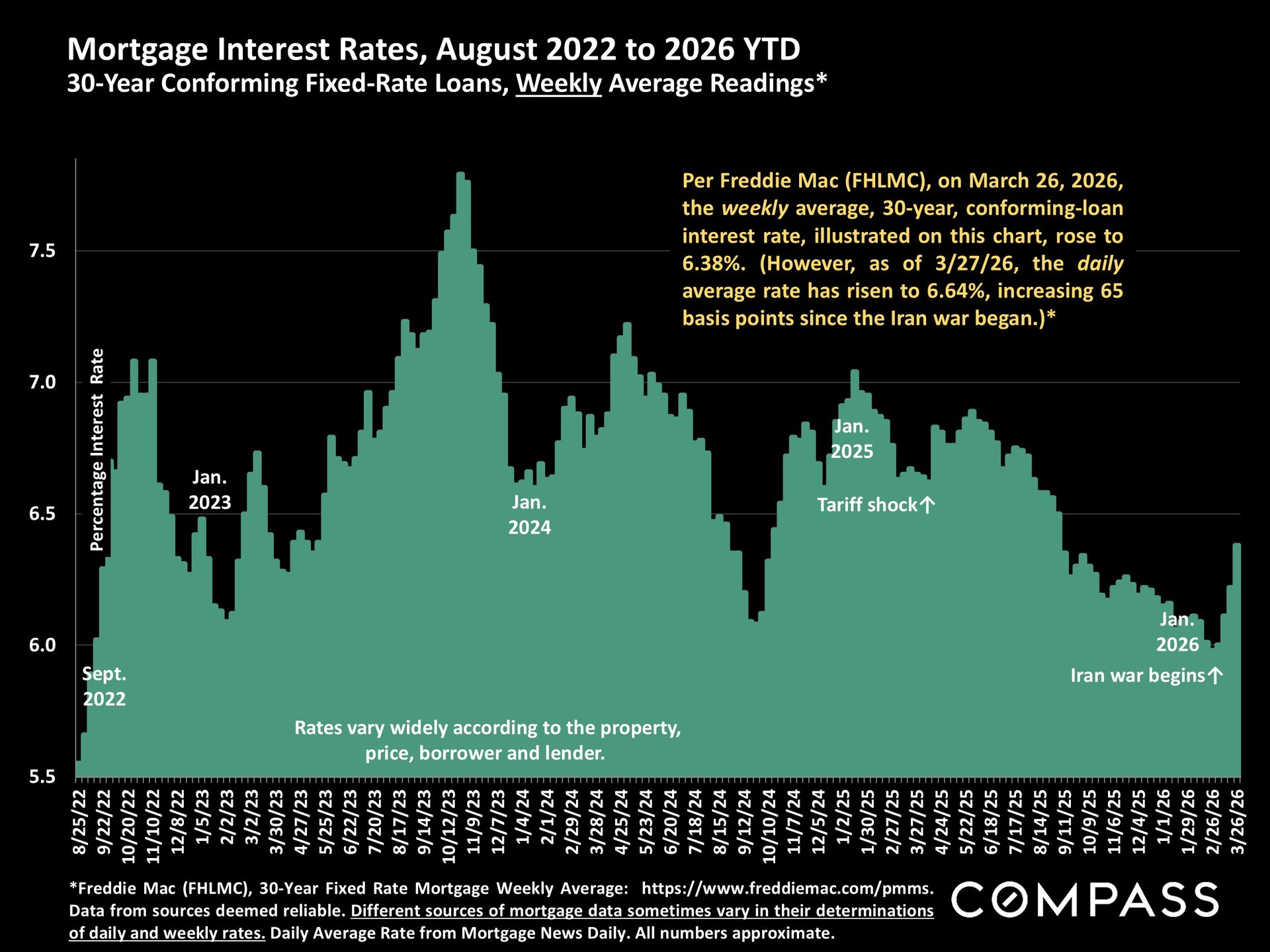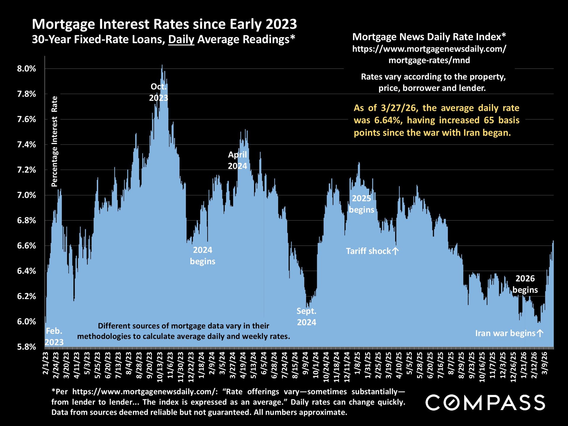Mortgage interest rates: The average weekly rate hit 6.38% yesterday, while the average daily rate hit 6.64% today