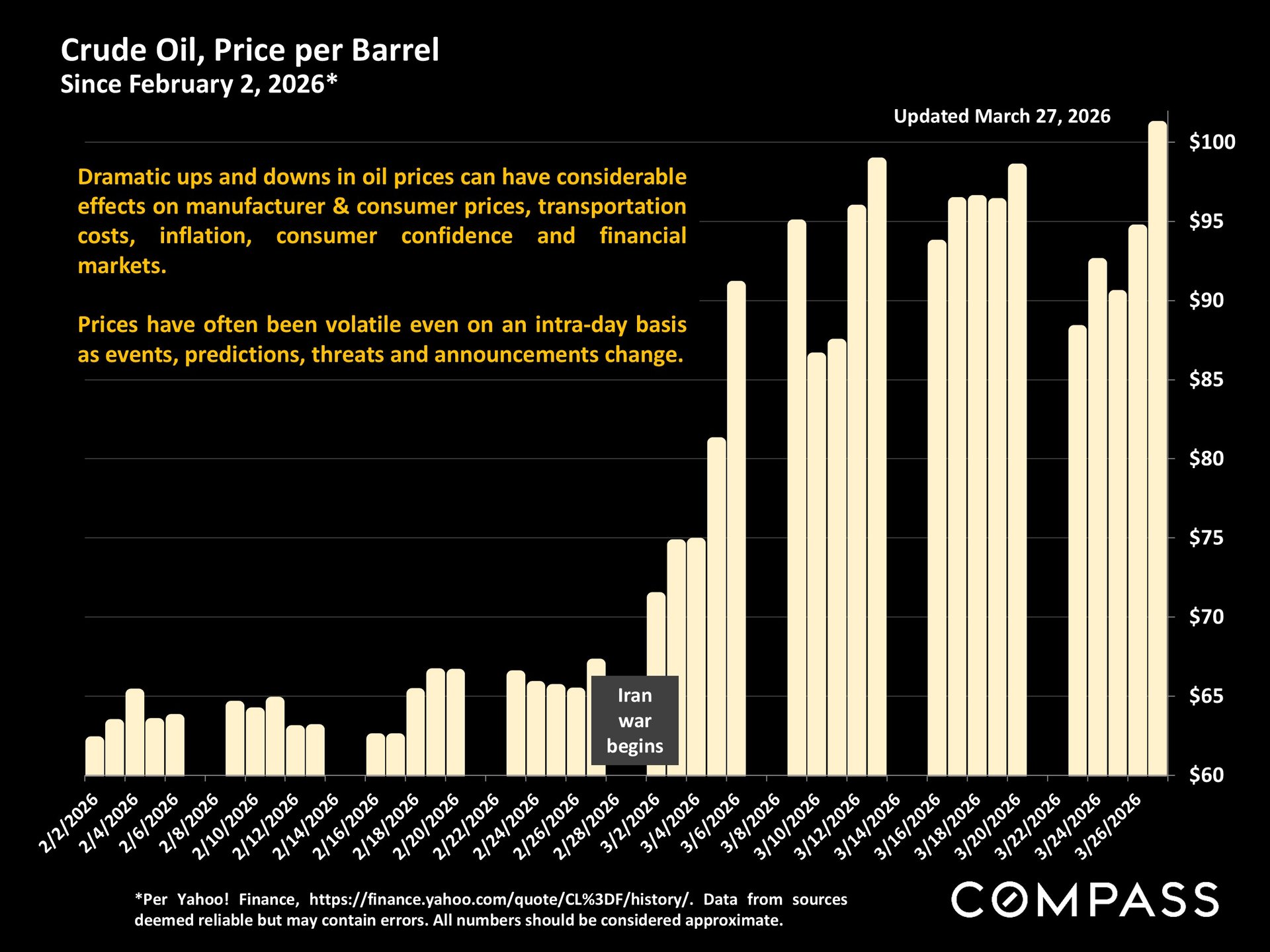 Oil & gas prices: Tremendous intra-day volatility in oil prices continues. Crude oil is up over 50% since the war began.