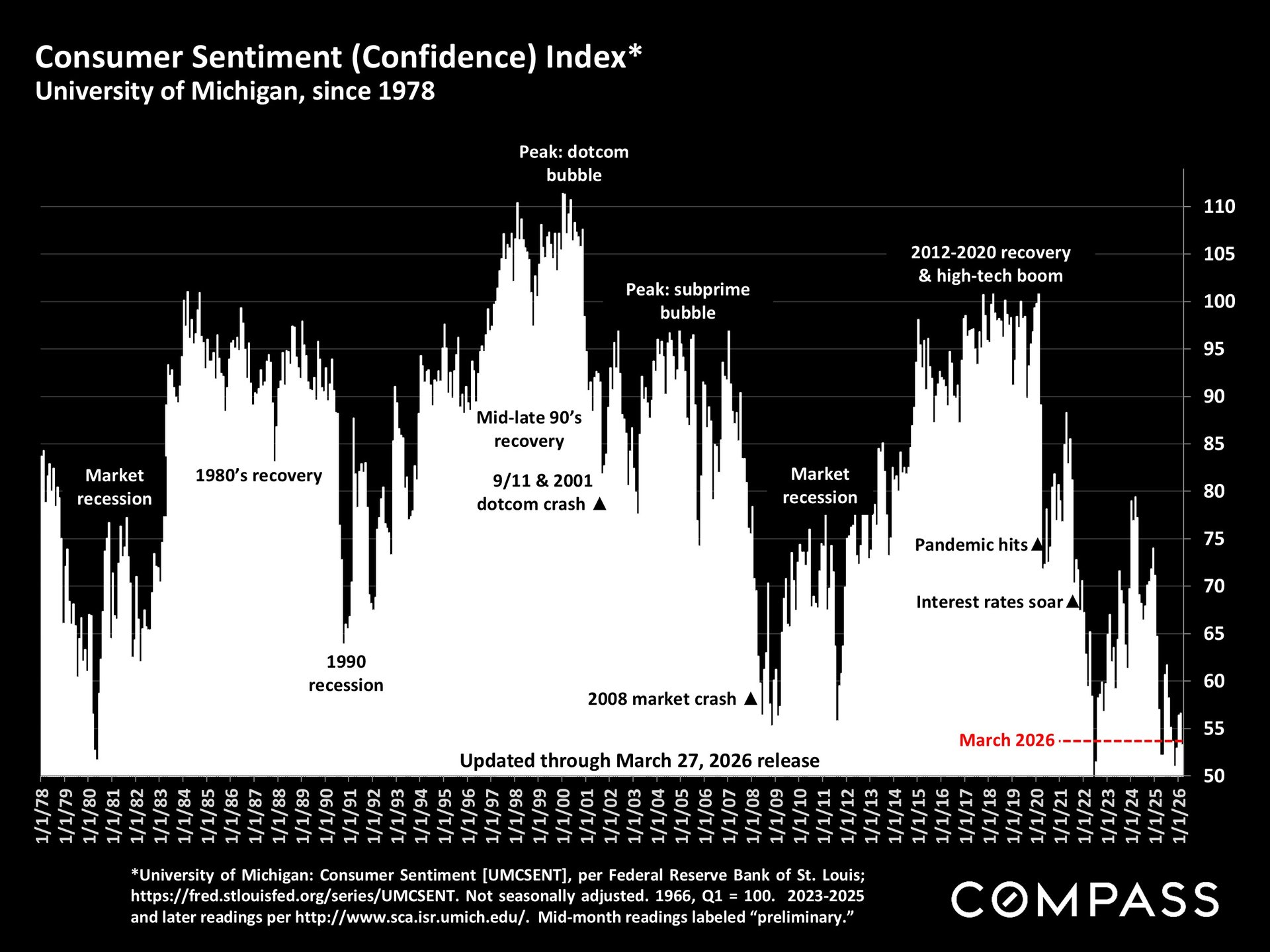 "Consumer sentiment fell back 6% this month to its lowest level since December 2025. Declines were seen across age and political party. Consumers with middle and higher incomes and stock wealth, buffeted by both escalating gas prices and volatile financial markets in the wake of the Iran conflict, exhibited particularly large drops in sentiment. Overall, the short-run economic outlook plunged 14%, and year-ahead expected personal finances sank 10%, while declines in long-run expectations were more subdued." University of Michigan Surveys of Consumers, 3/27/26 release