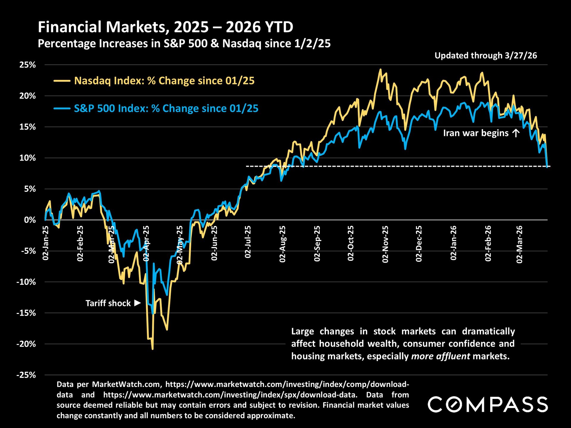 Stock markets: This chart illustrates appreciation since the beginning of 2025. However, looking just at 2026, the Nasdaq is down 10% and the S&P 500 is down 7% year to date.