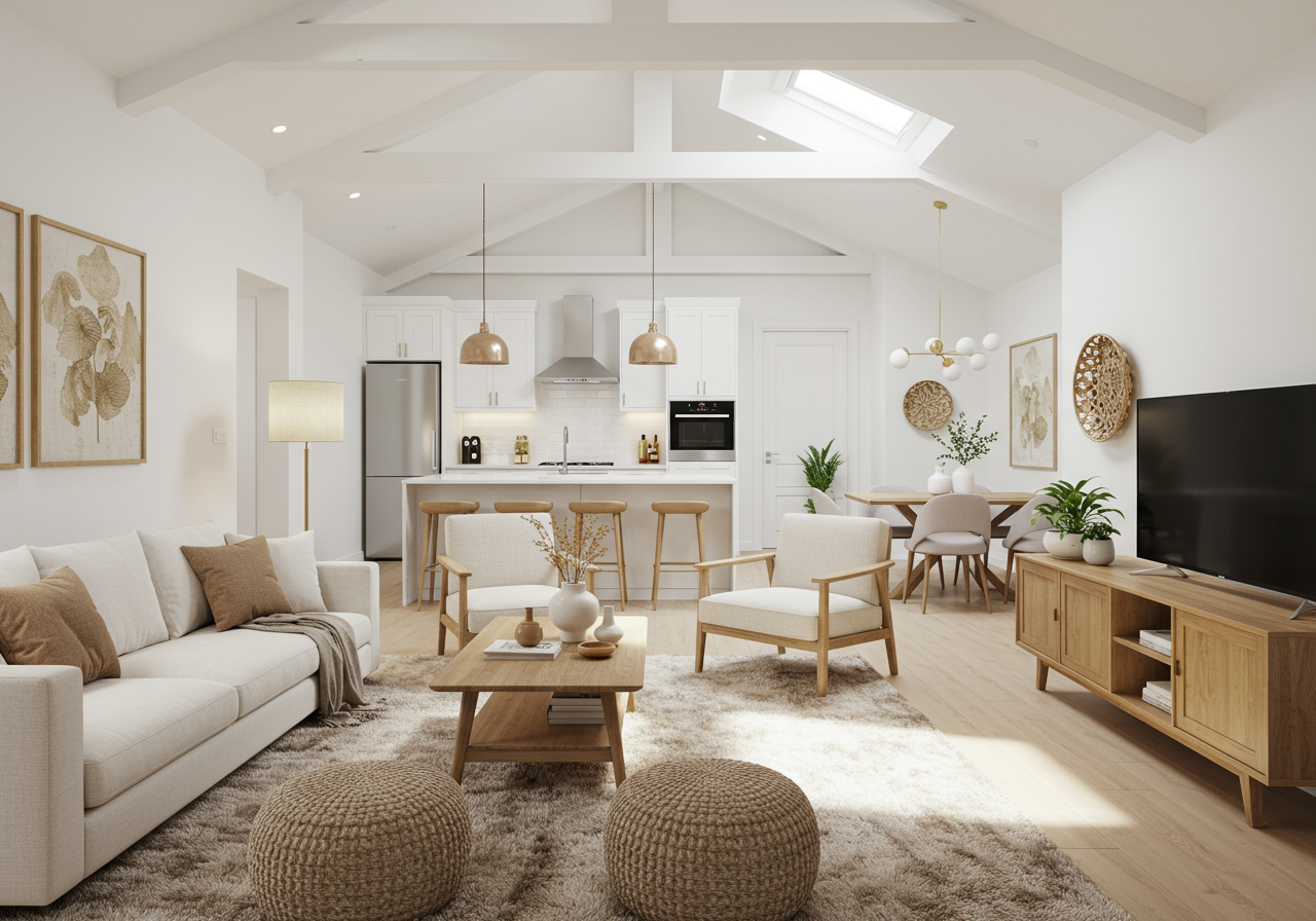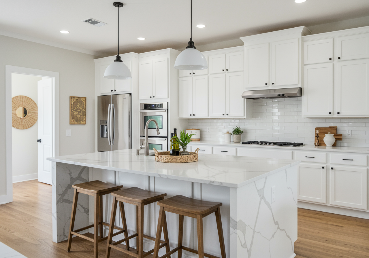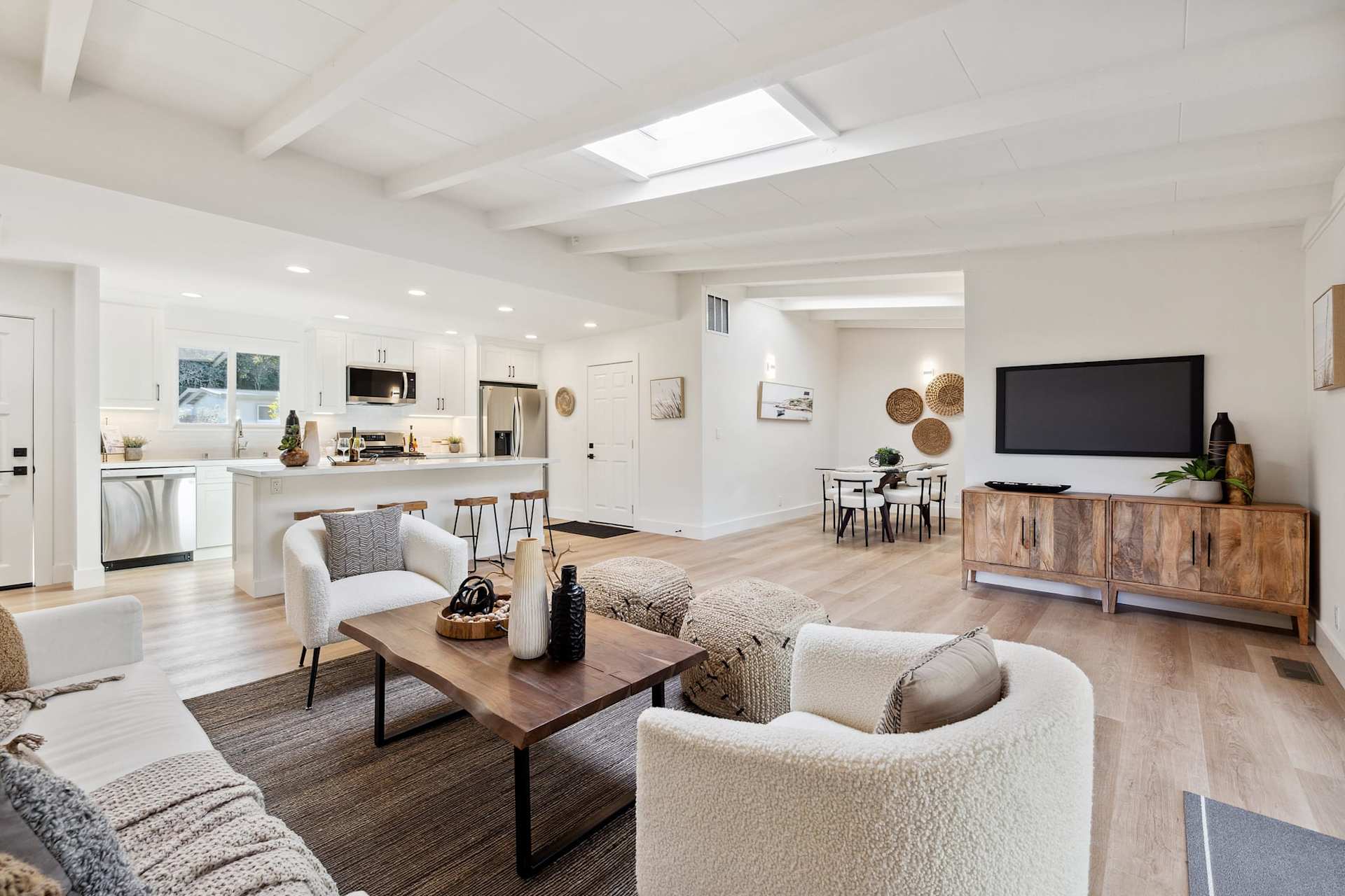 As you step through the front door, you're welcomed into a world of sunlit spaces and sophisticated design. The spacious living room, with its inviting ambiance, is perfect for both tranquil relaxation and lively entertaining. This area seamlessly transitions into a state-of-the-art kitchen, where modern appliances blend with sleek design to inspire culinary creativity. Whether you're a cooking aficionado or love hosting dinner parties, this kitchen, complete with a chic breakfast bar, is your stage.