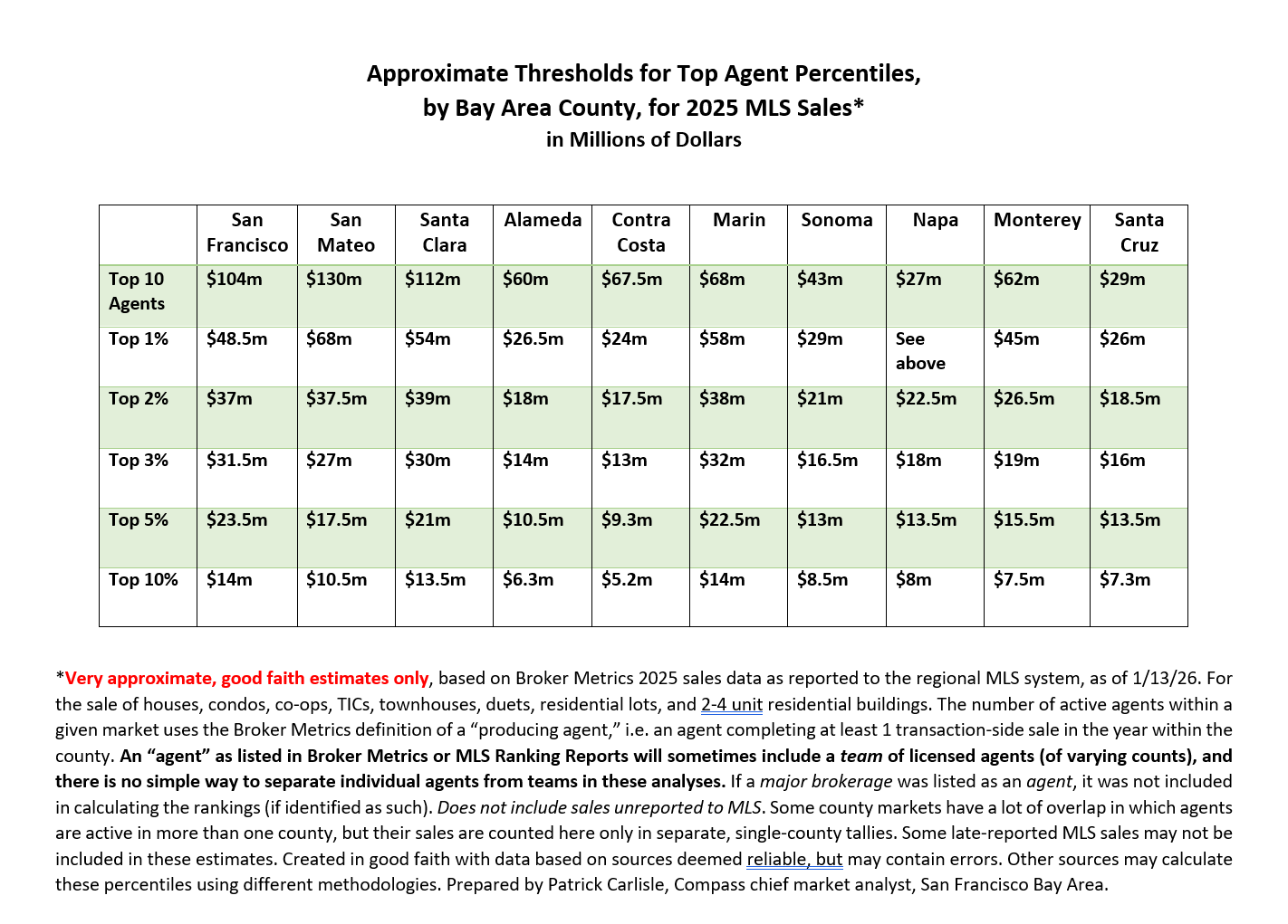 Calculating these thresholds is a muddy, imprecise business because of how "agents" are delineated and how sales reported in MLS - sometimes, an "agent" is 1 agent, or 2 agents, or a dozen or more, and sometimes includes agents, their children, grandchildren, nieces, nephews and pets - and there is no way to separate them out in MLS or Broker Metrics. Rankings are based on 2025 MLS-reported, dollar-volume, transaction-side sales, as of 1/13/26.